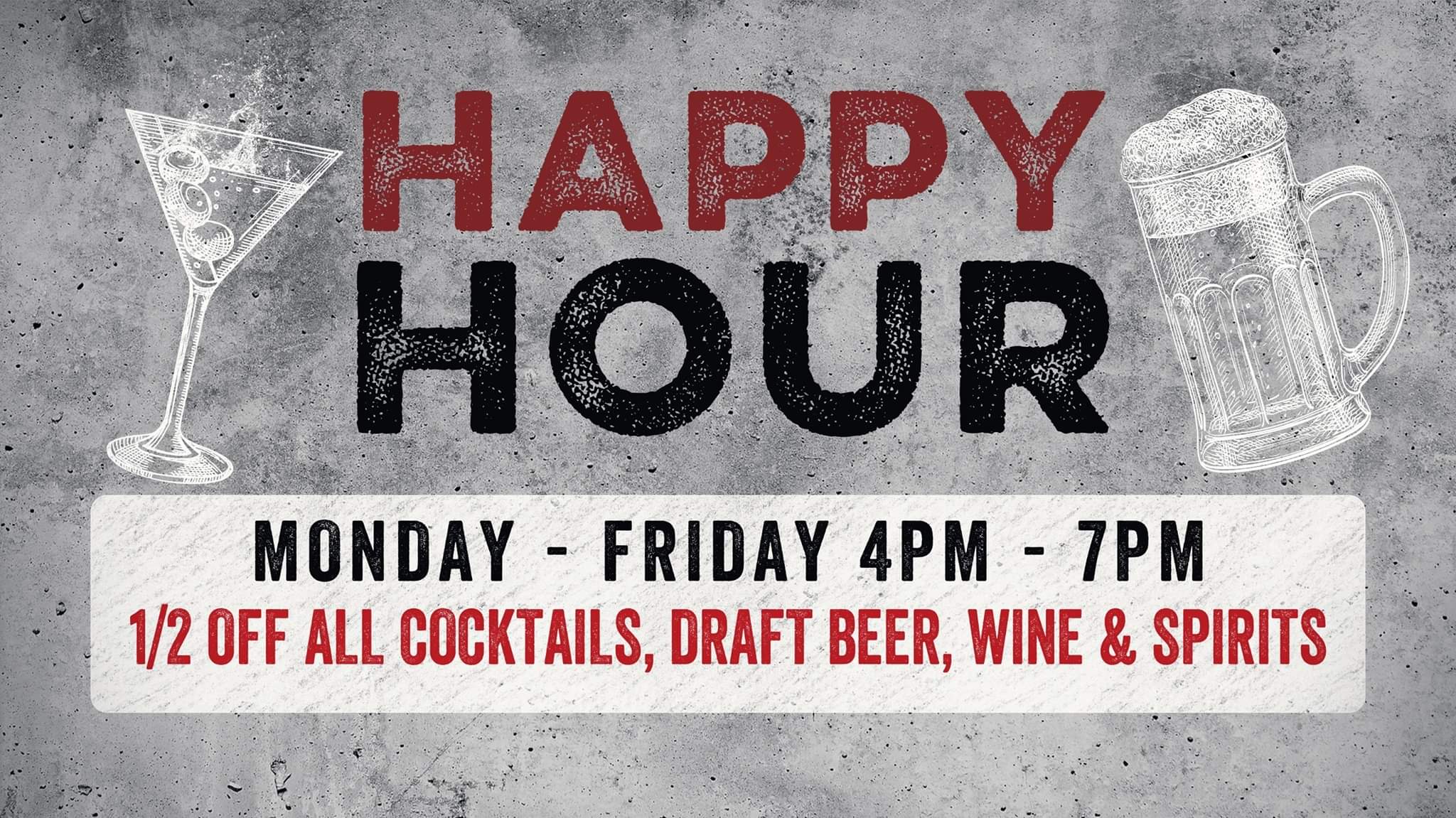 Monday through Friday, from 4-7 pm, drop in for 1/2 off off cocktails, draft beer, wine, and spirits. meaning you can order everything from four kinds of wings to a cheese board, calamari, and fried Brussels sprouts.