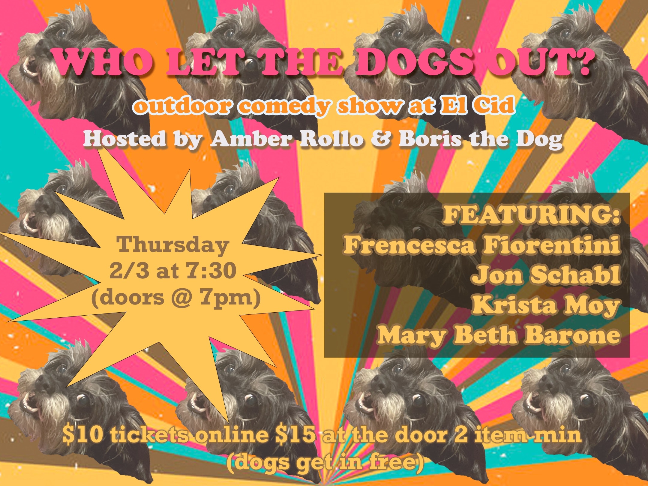 Who Let the Dogs Out is a standup comedy show featuring the BEST COMEDIANS IN LA on El Cid's beautiful pack patio the first Thursday of every month! Hosted by Amber Rollo and her pup Boris! Our flirty February show will feature sets by Frencesca Fiorentini, John Schabl, Krista Moy & Mary Beth Barone!