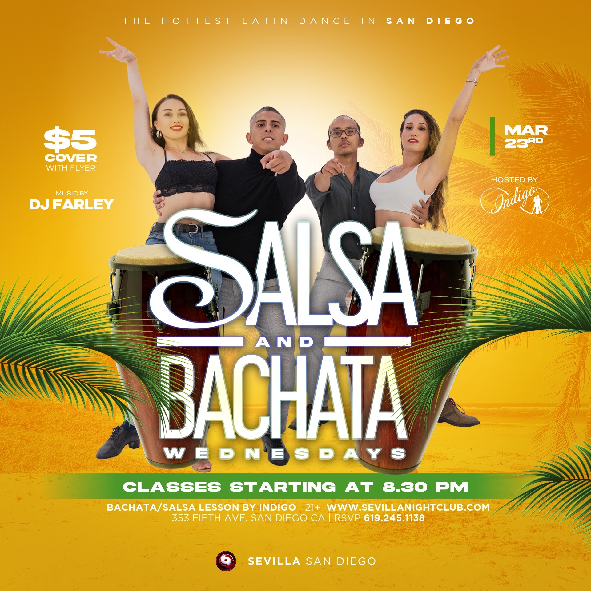 SALSA & BACHATA WEDNESDAYS WE Dance San Diego ! Music By Farley Classes Taught by INDIGO DANCE Salsa/ Bachata Lesson at 8.30pm $5 COVER with flyer Doors Open at 8 pm