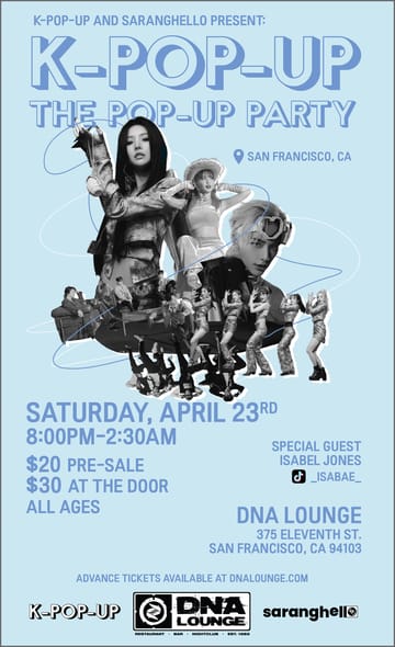 K-Pop lovers and enthusiasts unite and come dance the night away. The evening will include a dance workshop taught by K-Pop-Up, dance performances by the hottest kpop cover groups in the Bay, a special appearance and performance by Isabel Jones (aka _isabae_ from Tik Tok), Random Dance Play, a Kpop merchandise raffle with prizes provided by our sponsors SarangHello, and kpop DJs.