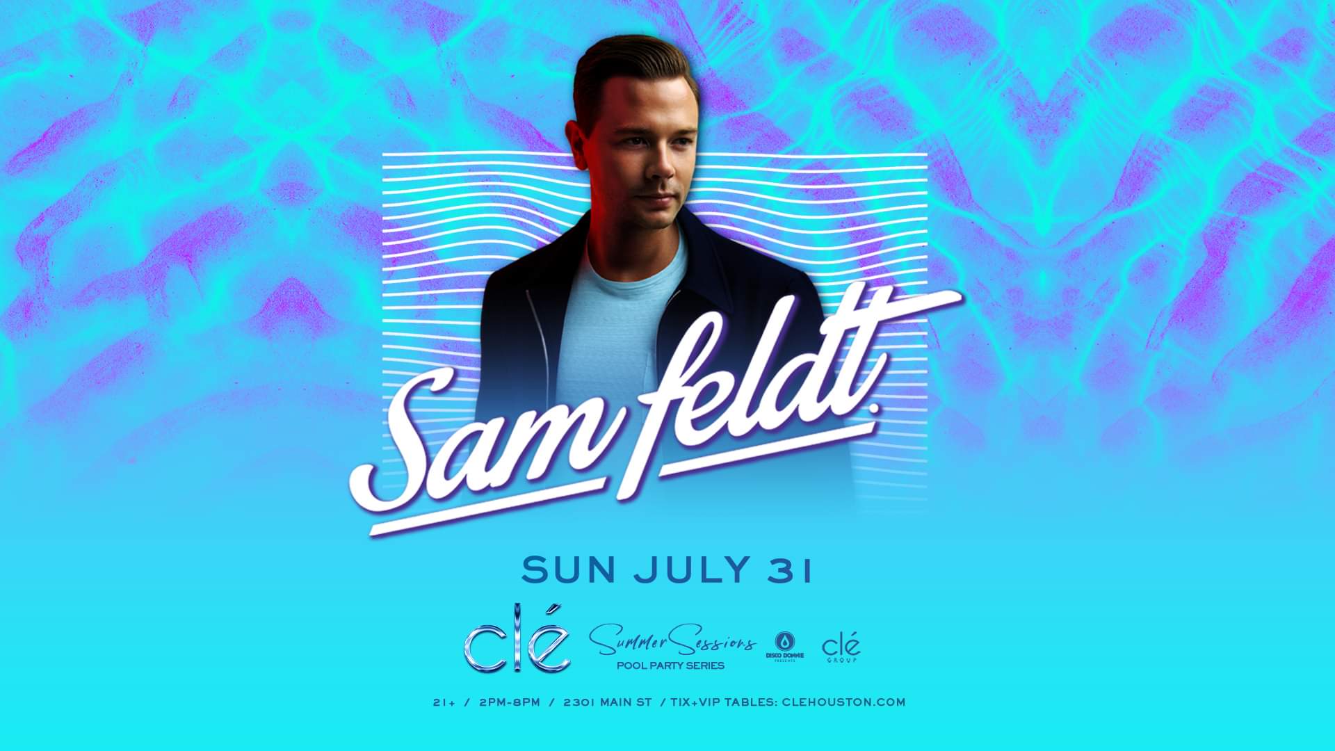 Clé Group and Disco Donnie Presents bring you: SAM FELDT Sunday July 31st, 2022 2pm-8pm 2301 Main Street Midtown Houston 21+ Only Dress Code: Fashionable Pool Attire Table Reservations: https://cletix.cc/VIP