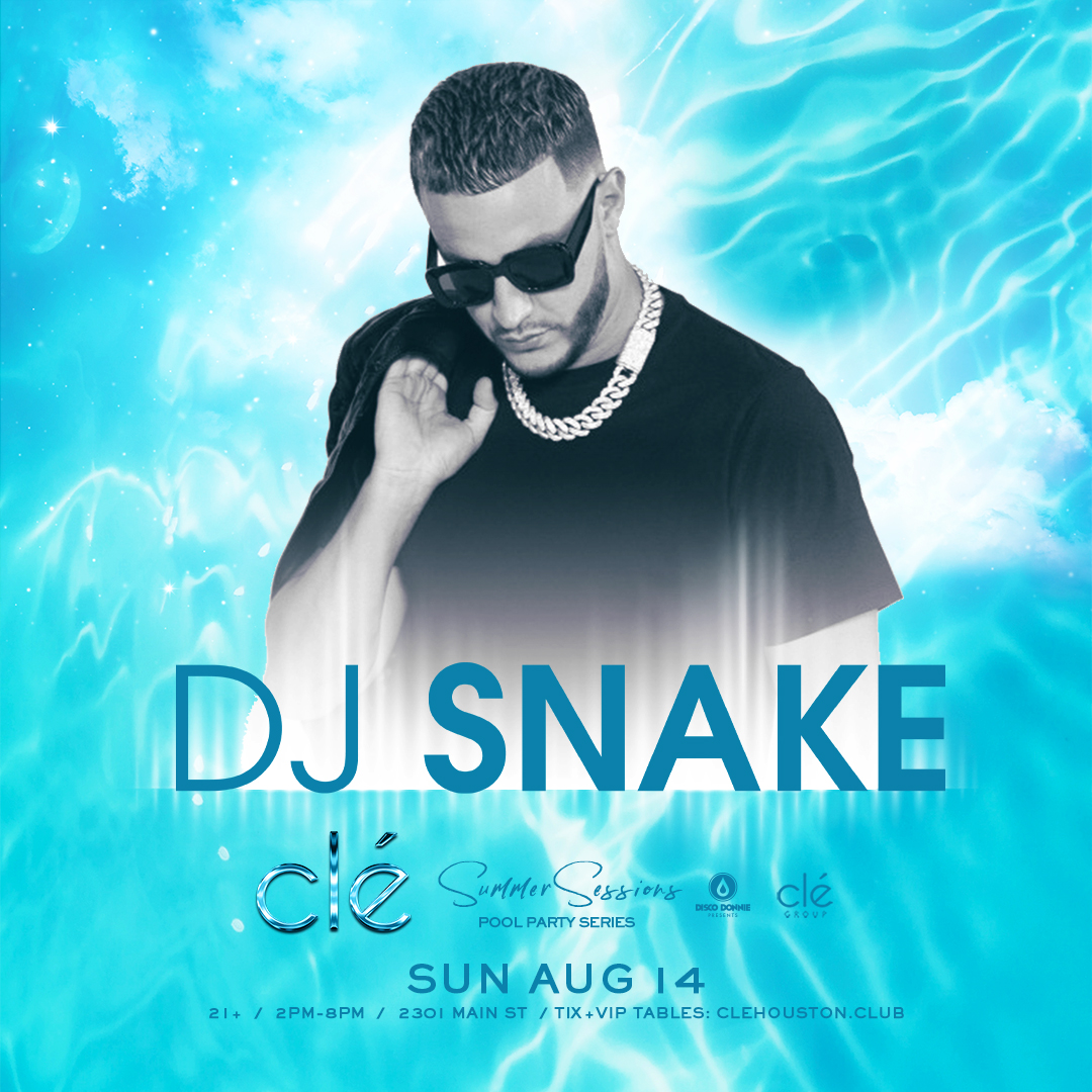 GET TICKETS: Sunday August 14th, 2022 Featuring: DJ Snake Little Martin & Phon 21+ Only Fashionable Pool Attire Dress Code VIP Table Reservations: https://cletix.cc/VIP 2301 Main Street Midtown Houston clehouston.com