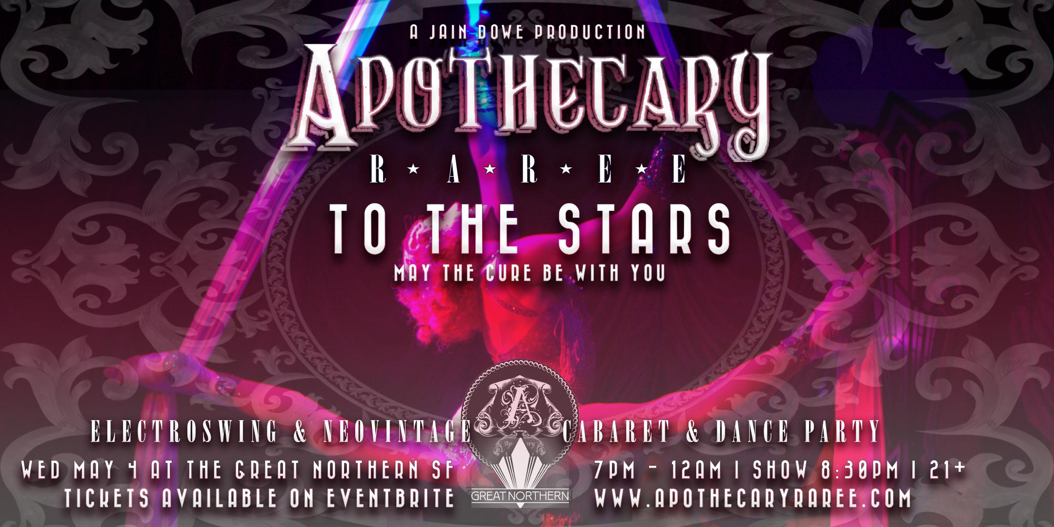 Get a dose of our featured Resident Apothecarians in the Raree Show!Electroswing tunes by DJ Cyril Noir100 Years of Great Music by Radio Gatsby Band!Our host and chanteuse Just Add Heather (Berber SF)Aerial Arts by Sandia DeLavibora of the Golden Gate DollsContemporary Burlesque by Jain Dowe (Vau de Vire Society)Interstellar Dueling by Lux Saber CorpsDance by Maggie Powers and Ismael Acosta (Vau de Vire Society, Capacitor)Sideshow Burlesque by Mojo DeVille (Haus Serpens)Belly dance by Pixie Fordtears and May Yang (Beats Antique)Stilting Acro by Shannon Gaines (Vau de Vire Society)
