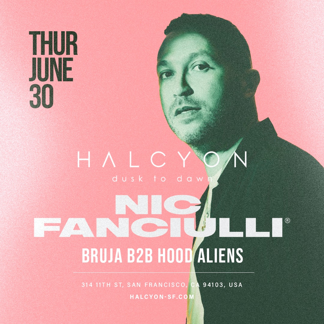 NIC FANCIULLI makes his club debut. We are SAVED! Local loves BRUJA B2B HOOD ALIENS open up the night. Presented by Halcyon. This is an 21+ event