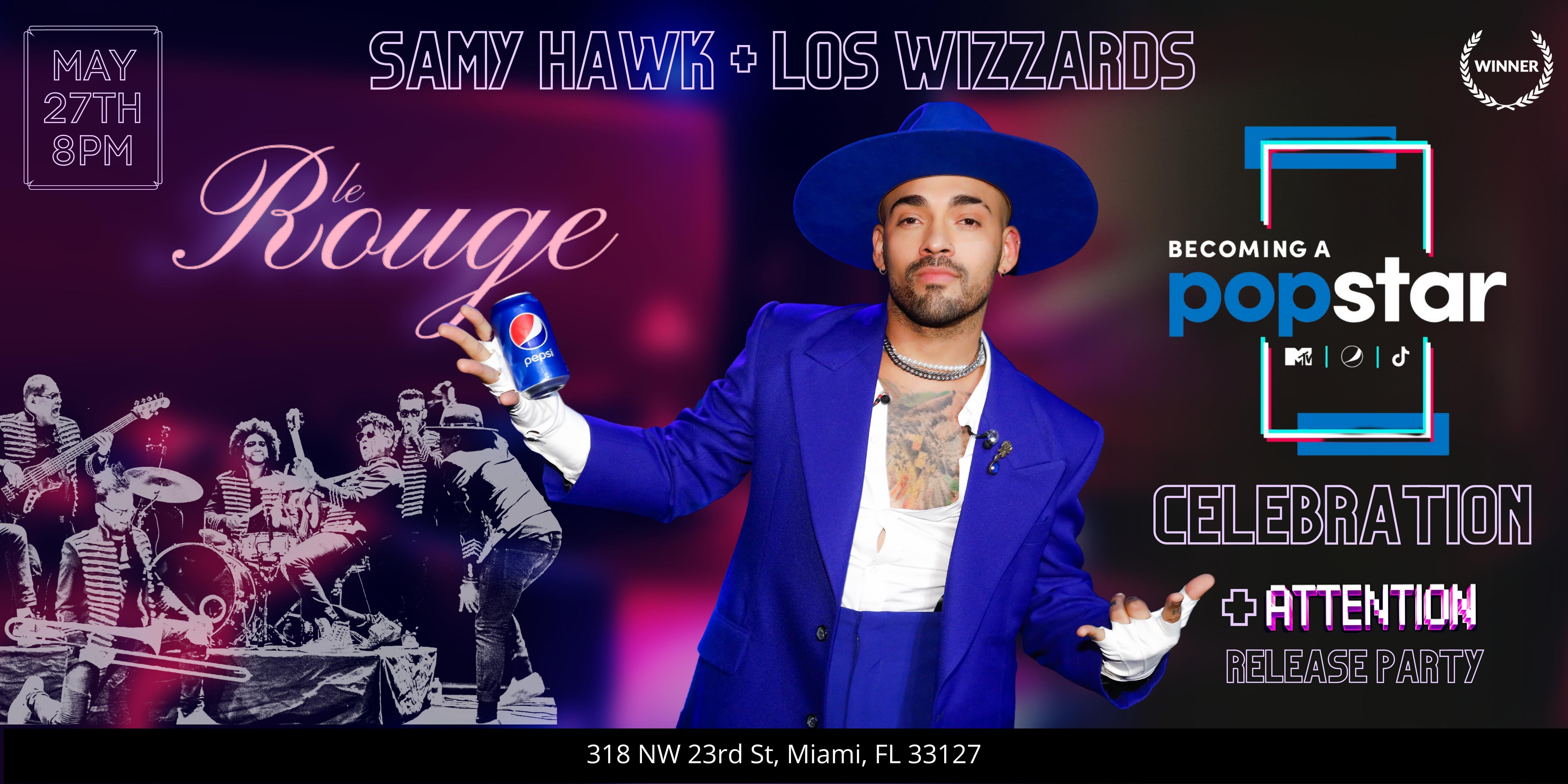Fresh off his recent win on MTV's "Becoming a PopStar" Miami icon SAMY HAWK and his band Los Wizzards host an incredible evening of friends and music featuring special live performances and guests along with a full after party !