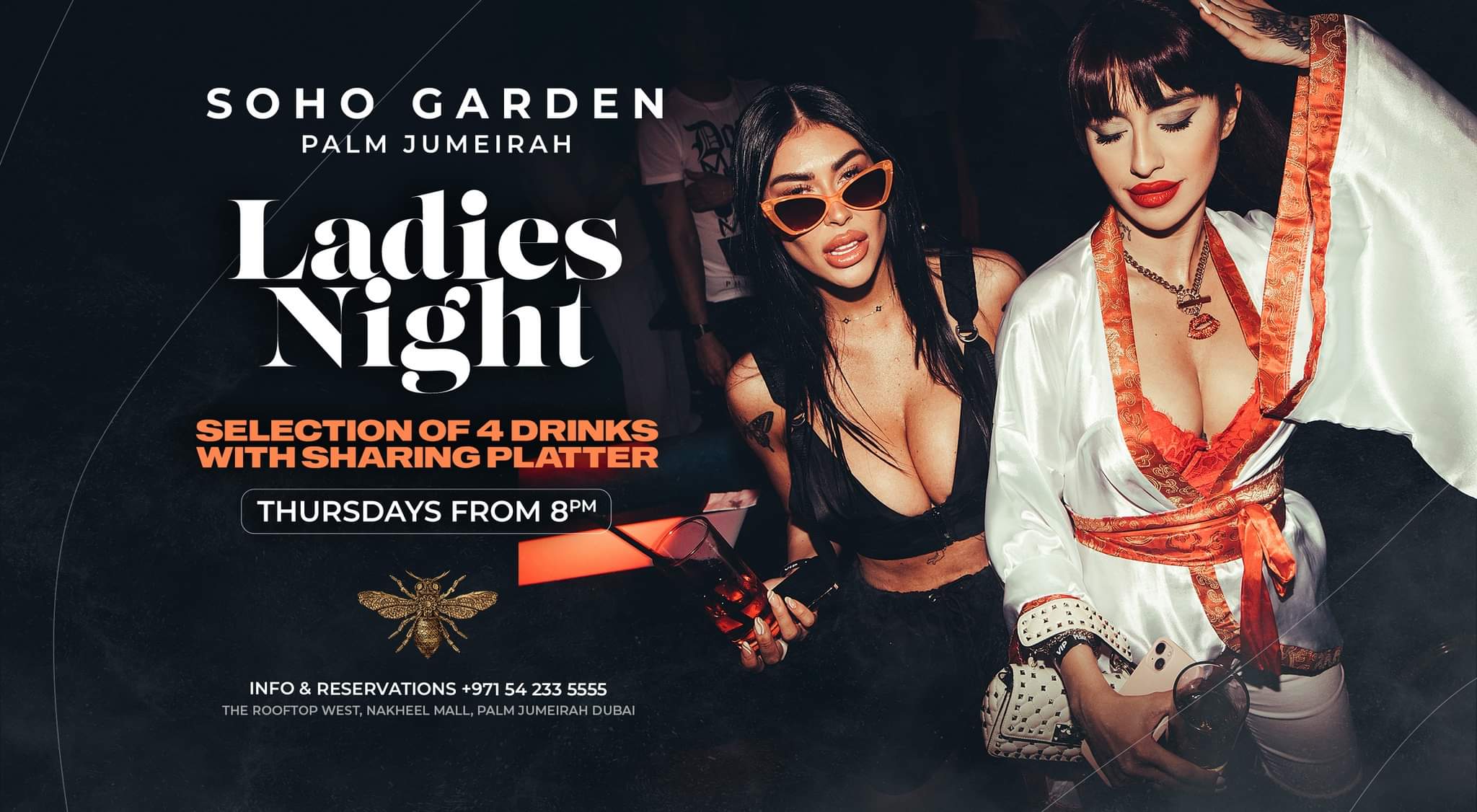 Ladies Night at Soho Garden Palm Jumeirah!๐ฅ๐ Join our Ladies Night every Thursday. Enjoy a selection of 4 drinks with sharing platter. Info & Reservations via +971 54 233 5555 or www.sohogardendxb.com #DestinationSoho