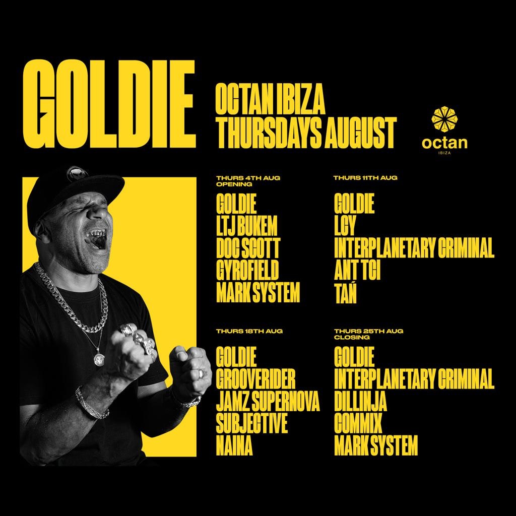 **Octan Ibiza pres. Goldie** Goldie LTJ Bukem Mark System Doc Scott gyrofield **Boutique hosted by Balearic Break:** Hadley Darren Jay Jazzy Q-Kraft & Filtah Presentato da Octan Ibiza. This is a 18+ event.