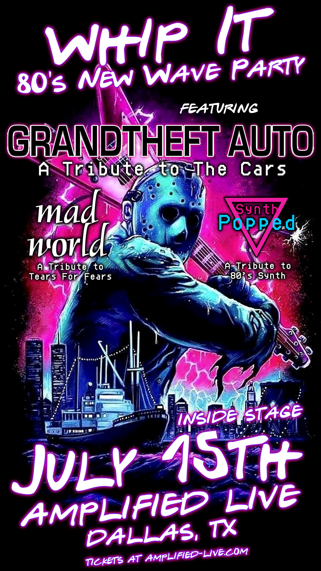 Amplified Live Presents INSIDE STAGE Whip It: 80's New Wave Party featuring Grandtheft Auto (The Cars) mad World (Tears for Fears) Synth Popped (New Order, Depeche Mode, Pet Shop Boys, Erasure + More) July 15th, 2022 All Ages Doors 7pm Show 8pm