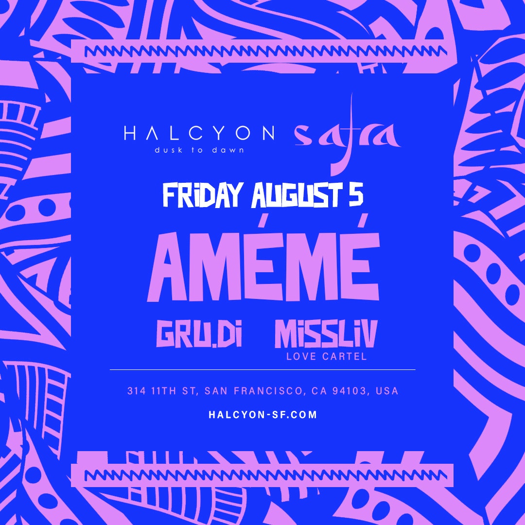 AMEME the afro-house sensation and founder of ONE TRIBE makes his SF debut! SAFRA presents star GRU.DI + Love Cartel darling MISSLIV set the night up for this West African tour de force. Presented by Halcyon. This is an 21+ event