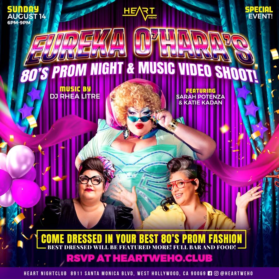 EUREKA O'HARA'S 80'S PROM AND MUSIC VIDEO SHOOT! EXPERIENCE THE PROM YOU WISH YOU HAD! PERFORMANCES - DJ - BAR - FOOD - YOU IN YOUR 80'S PROM FASHION! DJ RHEA LITRE FREE COVER WITH RSVP PLEASE NOTE YOU ARE CONSENTING TO BE FILMED WITH YOUR RSVP