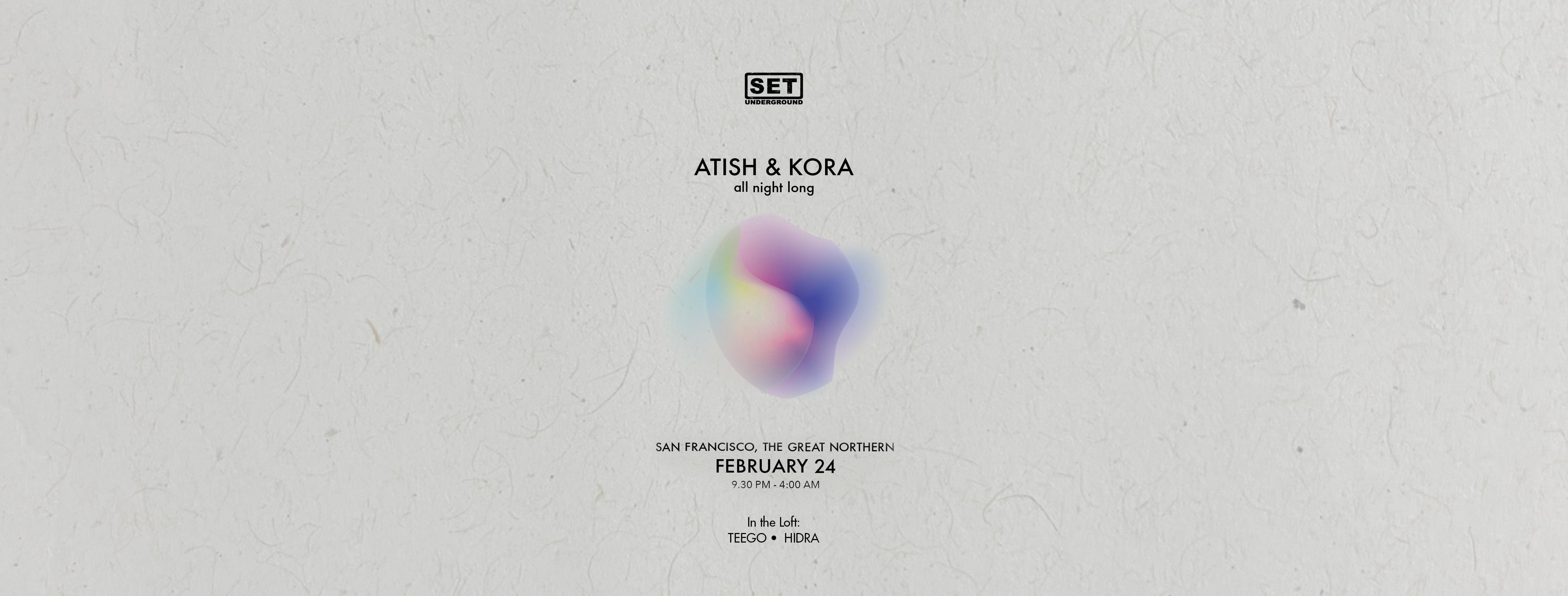 SET Underground with Atish (Manjumasi) & Kora (Saisons/Anjunadeep) all night long at The Great Northern.