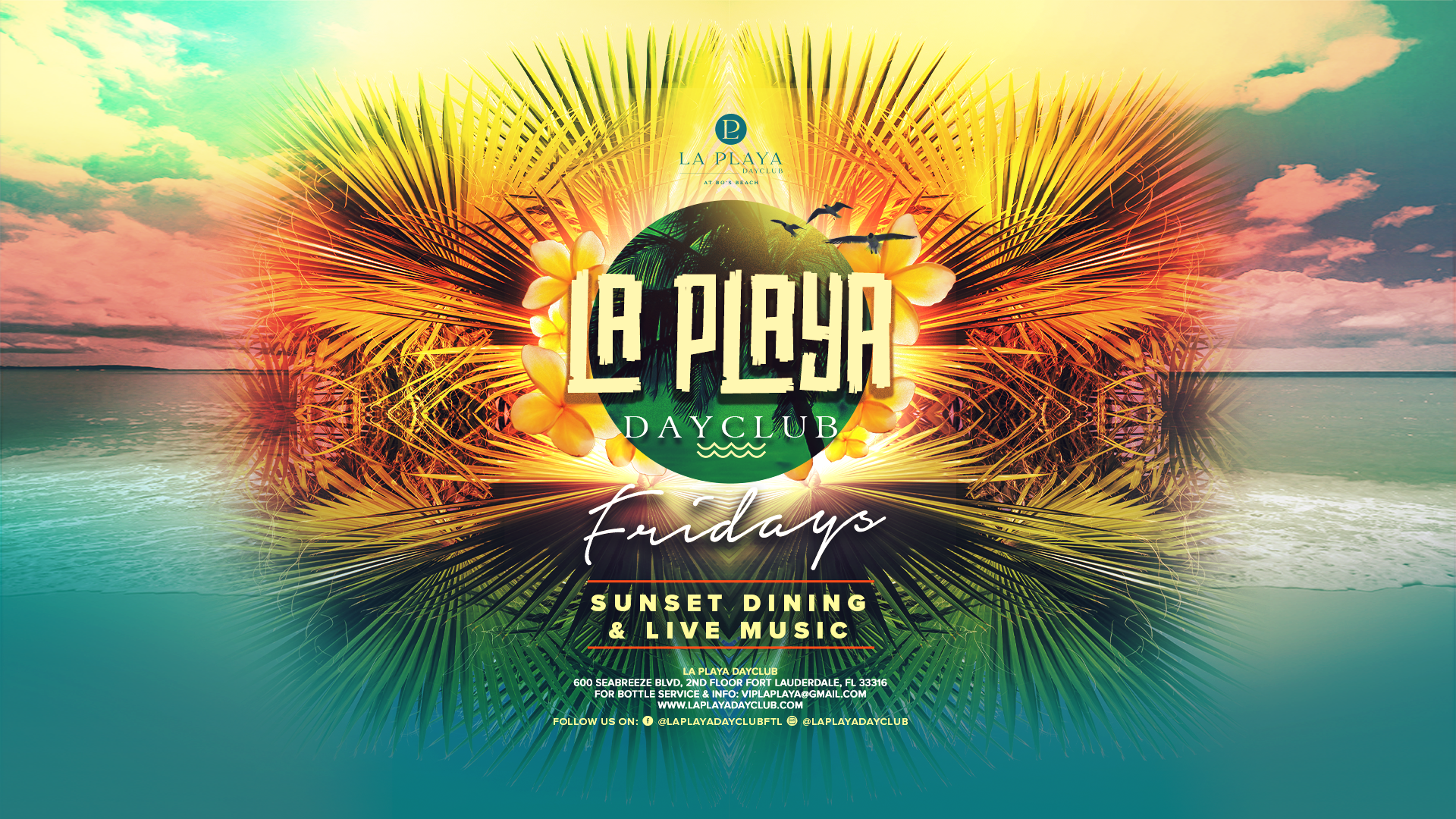 Sunset Dining & Live Music Every Friday At La Playa Dayclub! Drink, Dance, & Dine steps away from FTL Beach Every Friday La Playa Dayclub! Enjoy the beautiful sunset & listen to live music! 4pm - 10pm 21+
