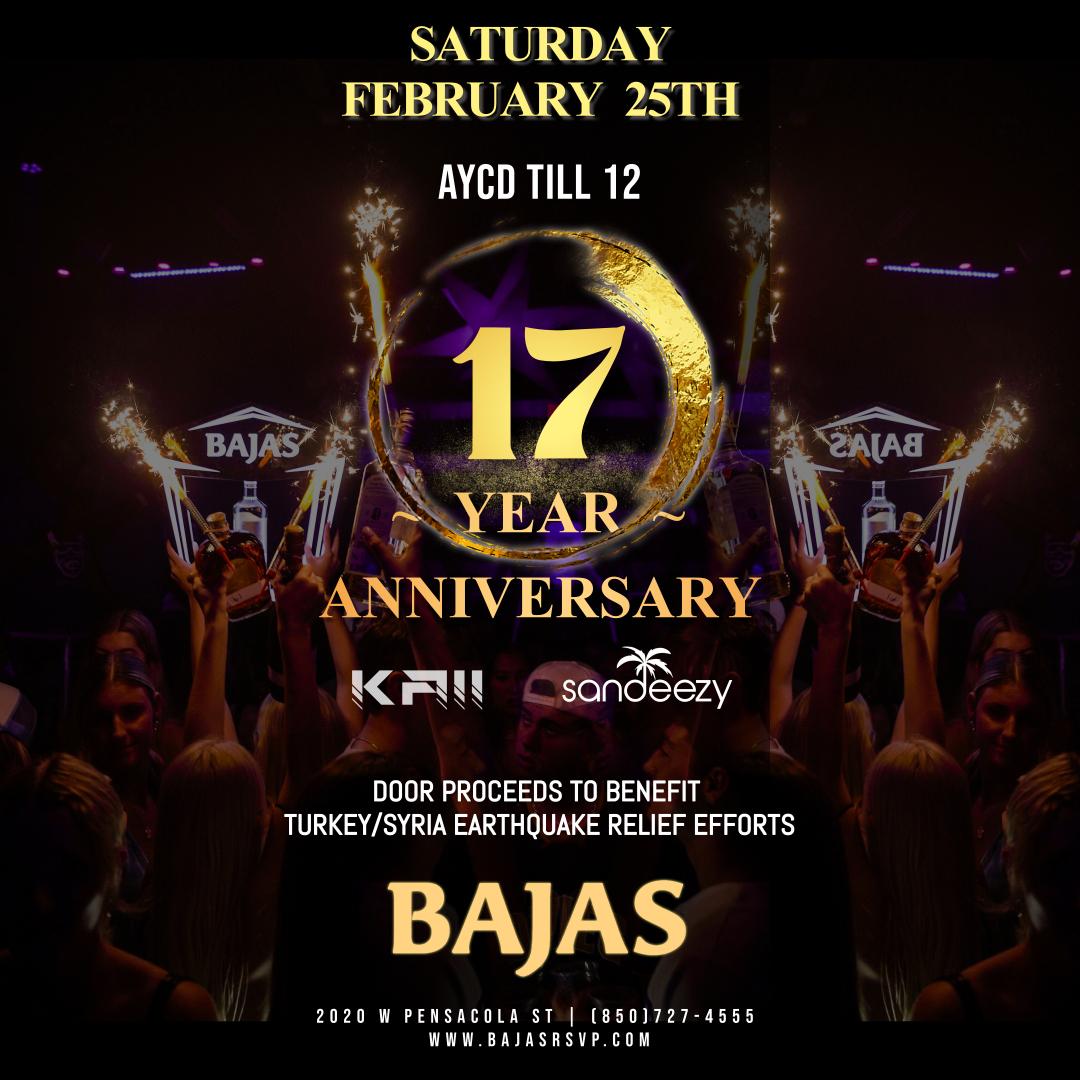 #BAJASSATURDAYS SATURDAY FEBRUARY 25TH - BAJAS 17 YEAR ANNIVERSARY AYCD TILL 12 - $10 GENERAL ADMISSION DOOR PROCEEDS TO BENEFIT TURKEY/SYRIA EARTHQUAKE RELIEF EFFORTS