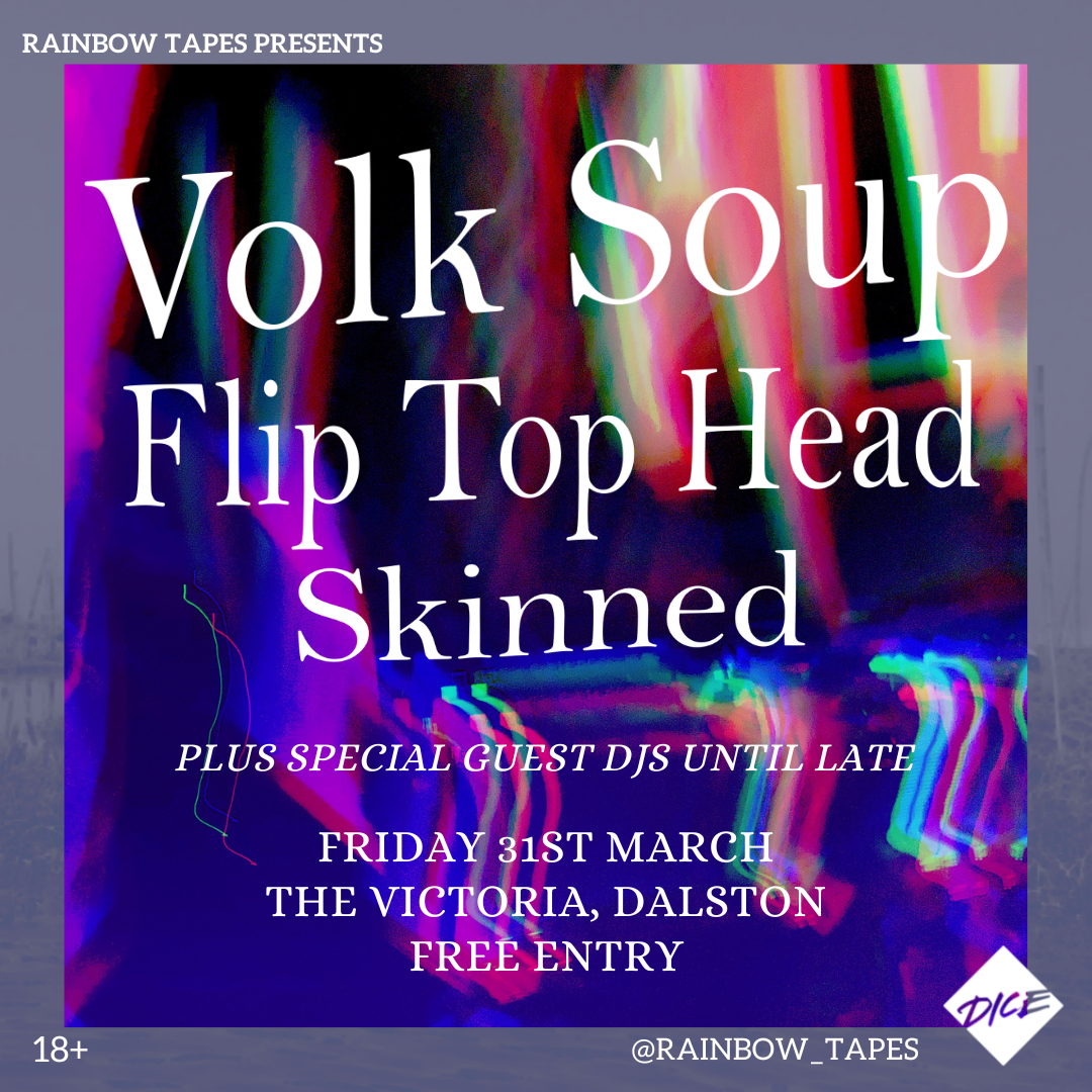 We’ve curated a devastating lineup consisting of some of the best up and coming talent in the alternative scene. Abrasive three piece Skinned will be kicking us off, the gorgeously dynamic Flip Top Head will see us into the night and brazen punks Volk Soup will level the Vic into the stratosphere. Rainbow Tapes DJs will be spinning tunes all night long after.