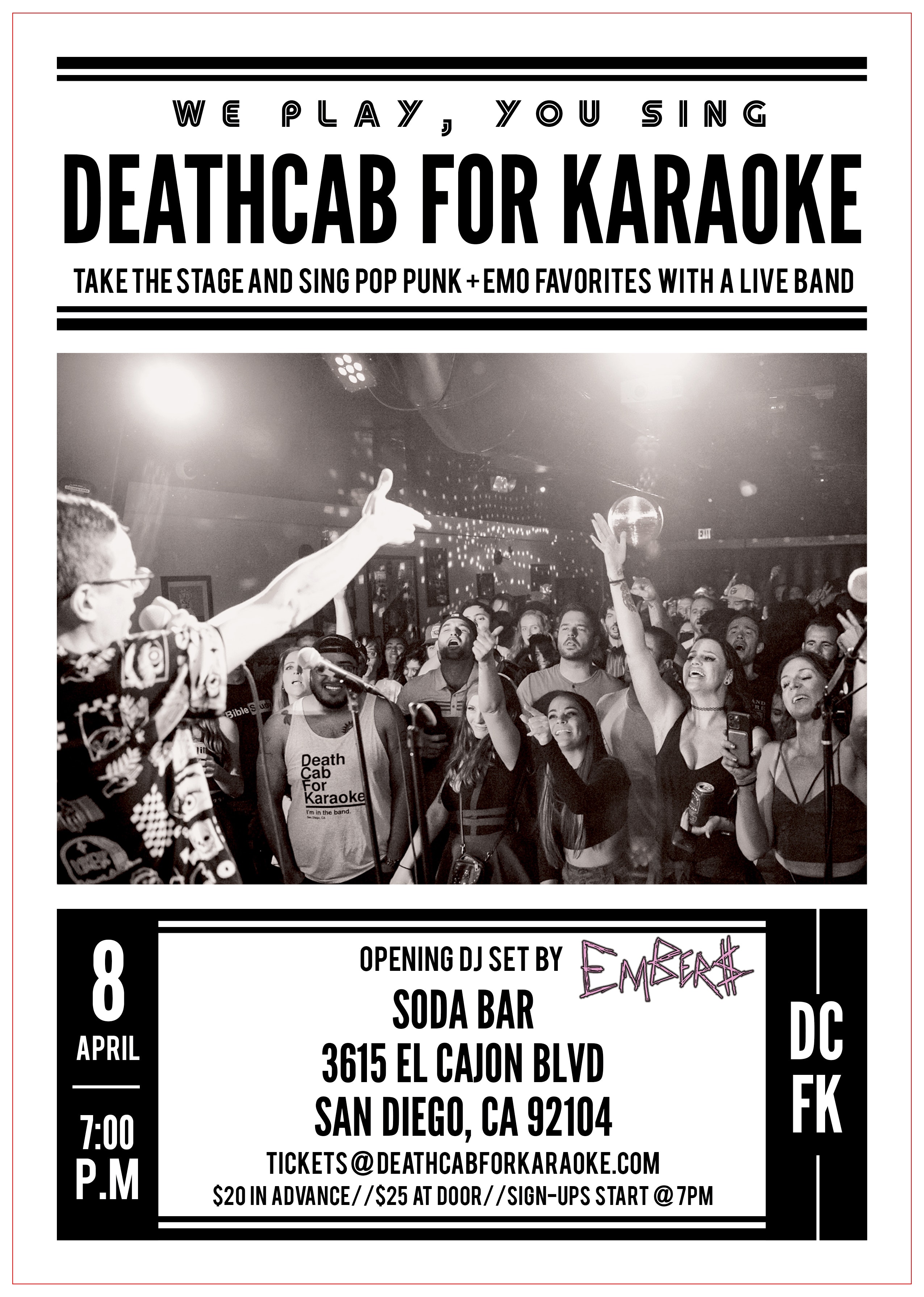 Death Cab for Karaoke - live band karaoke! Take the stage and sing pop-punk + emo favorites with a live band! https://instagram.com/deathcabforkaraoke/ Presented by Soda. This is a 21+ event
