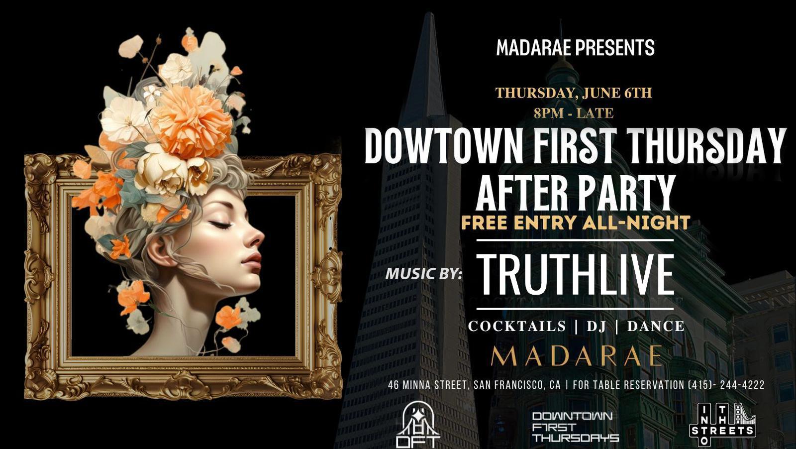 No Cover Charge. Live DJs, Dancing, Cocktails & Bottle Service. Downtown First Thursdays Official After-Party at Madarae Live DJs No Cover Charge Full Bar & Kitchen