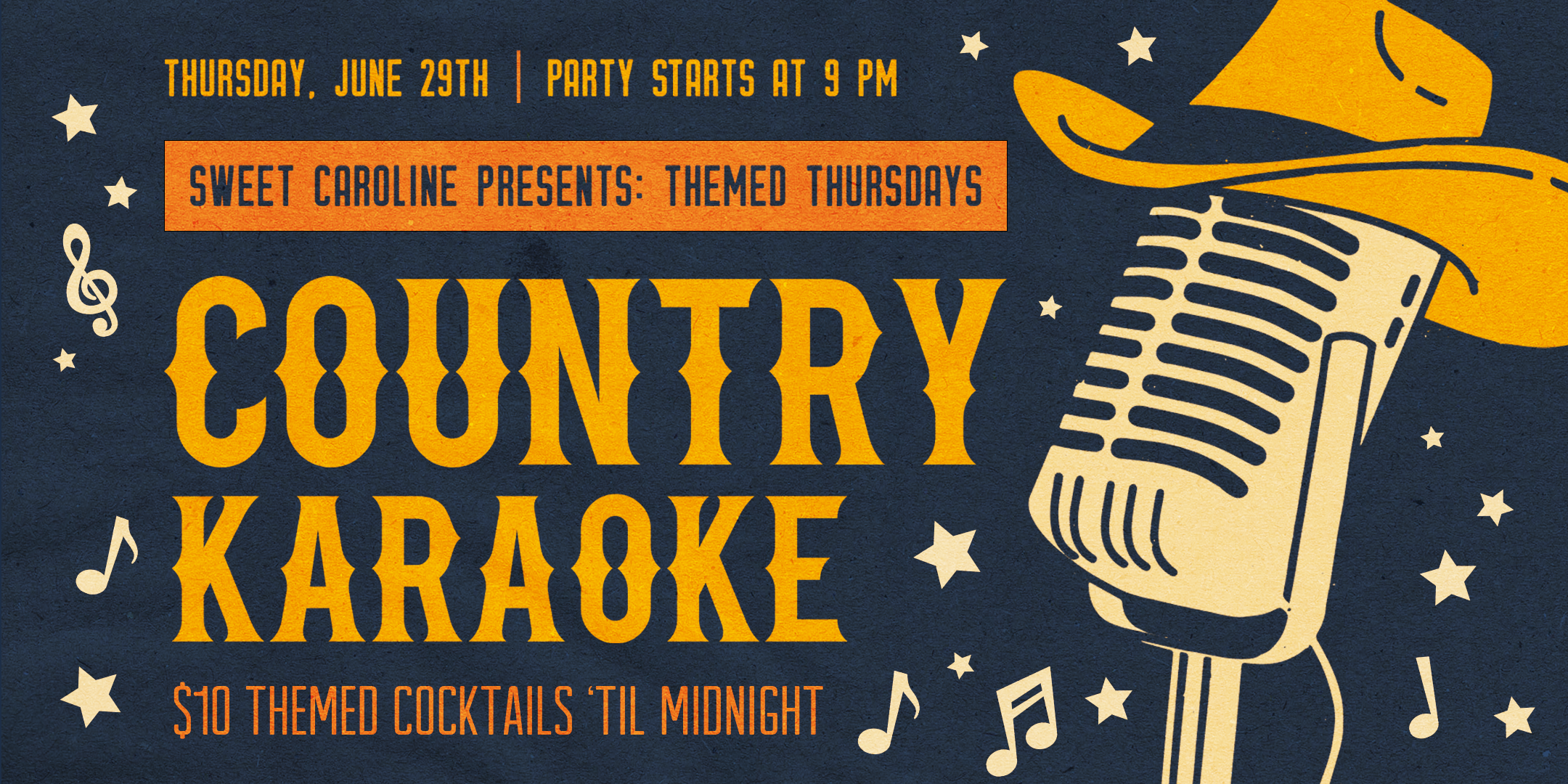Howdy, y'all! Round up your pals and head to Sweet Caroline on Thursday, June 29th for Country Karaoke starting at 9PM. Get ready to sing your favorite country classics while sipping on $10 Tennessee Whiskeys. We'll have line dancing from 9PM to 1AM and karaoke until 4 AM.