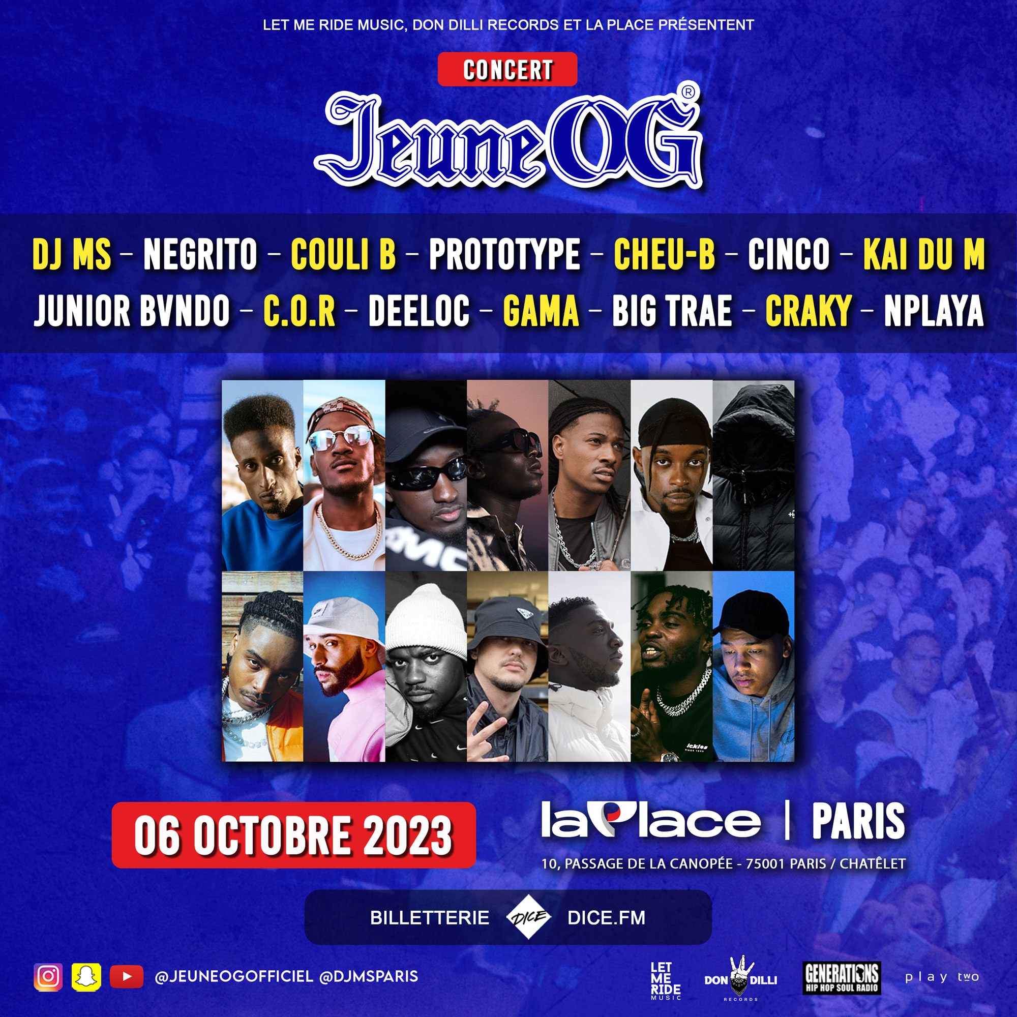 Dans le cadre du nouvelle opus " JEUNE OG ", une fusion de nouveaux talents et de créativité orchestré par DJ MS, retrouves tous les artistes présents sur ce nouveau projet en concert à La Place le 06 Octobre 2023. Sur scène : NEGRITO, COULI B, PROTOTYPE, CHEU-B, CINCO, KAI DU M, JUNIOR BVNDO, C.O.R, DEELOC, GAMA, BIG TRAE, CRAKY et NPLAYA !