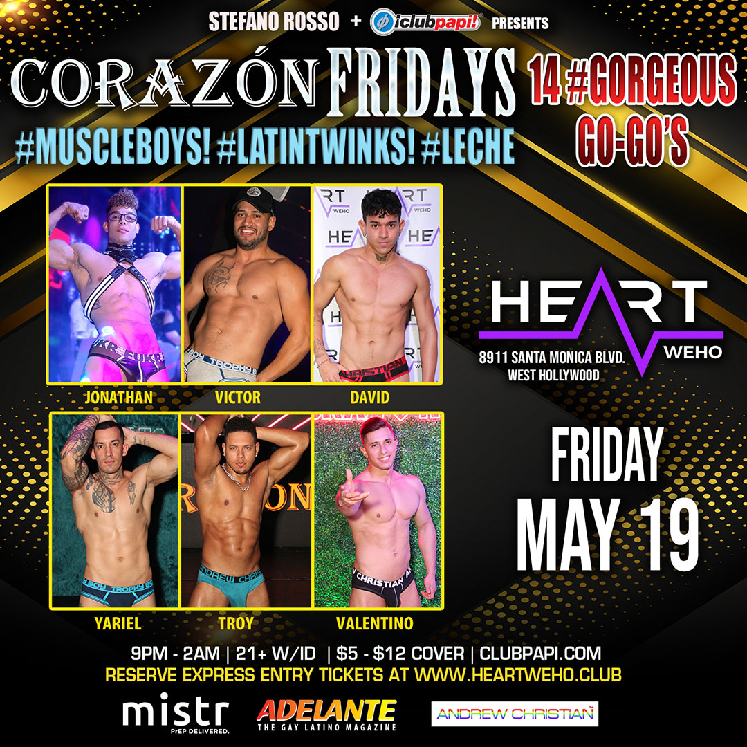 Club Papi & Stefano Rosso invite you to "CORAZON FRIDAYS" @HEART WEHO, on Friday, May 19 in West Hollywood. CORAZON FRIDAYS, AMERICA'S BIGGEST WEEKLY LATIN FIESTA