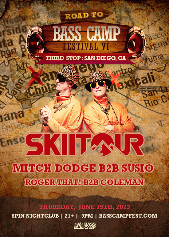Road to Bass Camp Festival VI stop number 3 San Diego at Spin Nightclub. Ft. SkiiTour Mitch Dodge b2b Susio Roger That! b2b Coleman 21+ doors 9pm Win a 3-day All In Hopper Pass just by buying a ticket in advance.