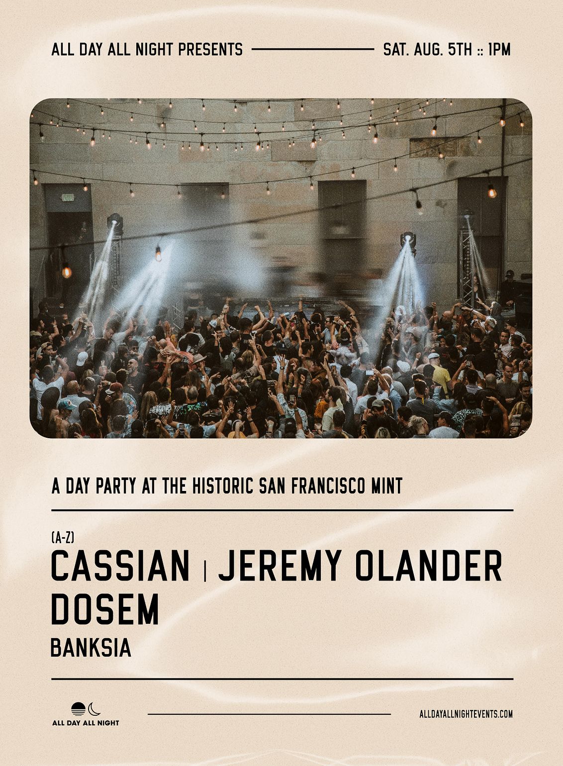 All Day All Night invites you to another day party at the Historic San Francisco Mint on August 5th featuring Cassian, Jeremy Olander, Dosem, and Banksia. This heavily curated lineup is one for the record books. Expect progressive house, deep house, and techno at one of the most beautiful venues in the country. This will sell out.