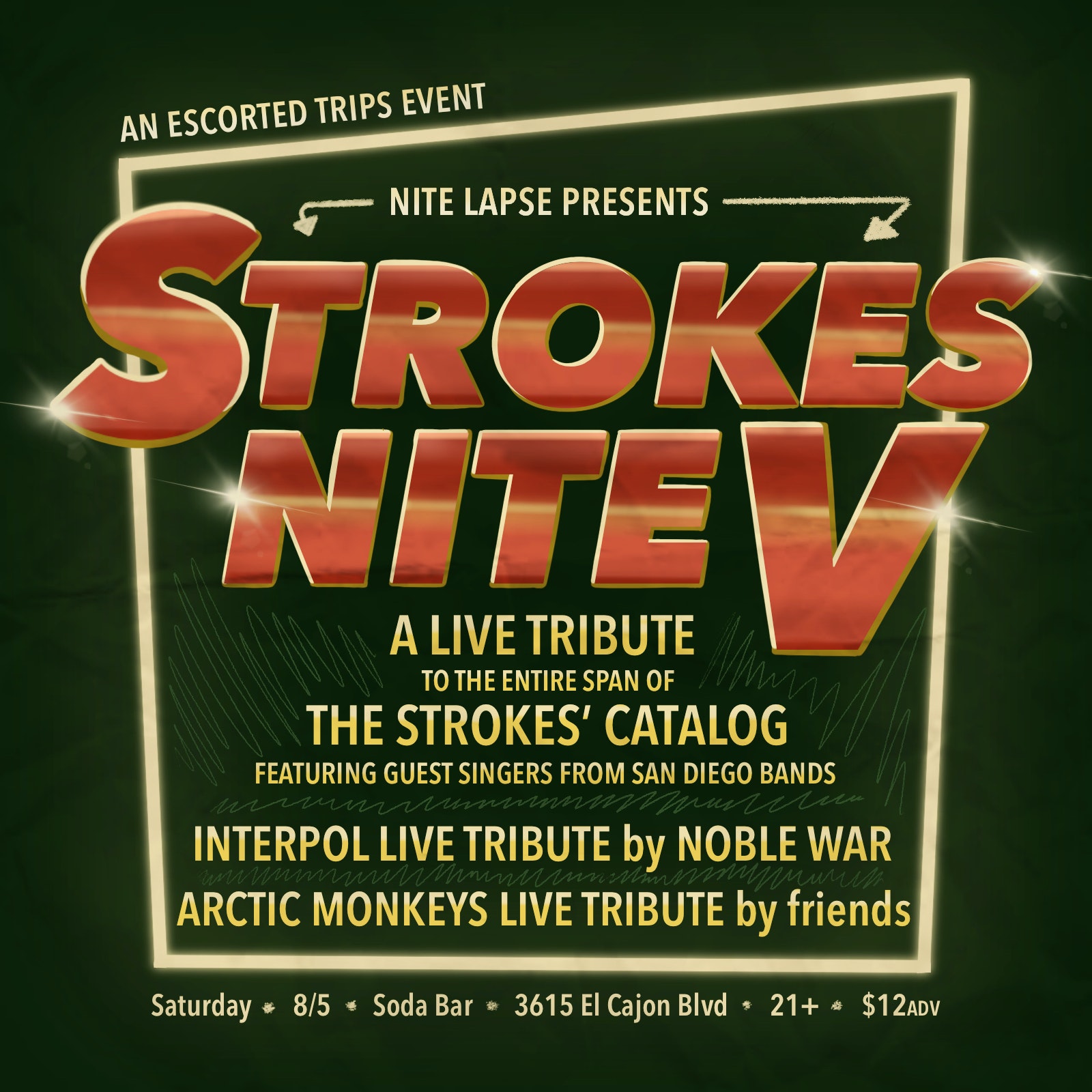 This is a 21+ event w/ valid ID. Nite Lapse presents STROKES NITE V – A live tribute to the entire span of The Strokes’ catalog ft. guest singers. Presented by Soda & Escorted Trips This is a 21+ event