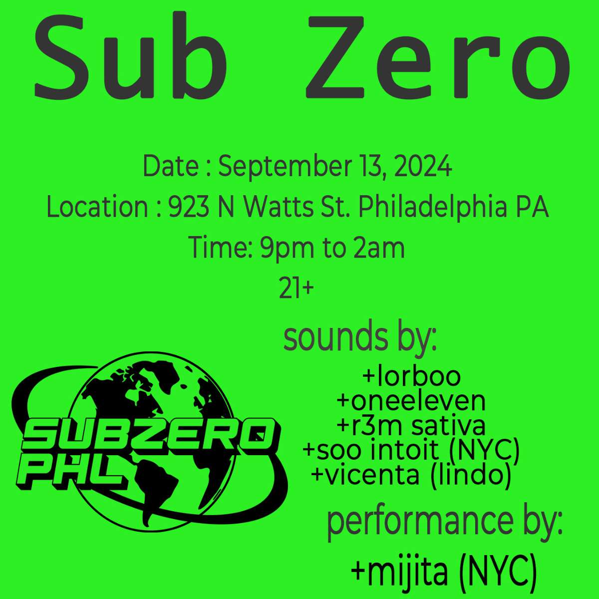 Sub Zero is back! Join us at 9 PM for a night of amazing music featuring DJ Lorboo, R3m Sativa, Oneeleven, and NYC’s Soo Intoit. We’ve got a special guest DJ lined up, and at 11 PM, Mjita from NYC will hit the stage for an epic performance. Don’t miss it—come early and stay late!