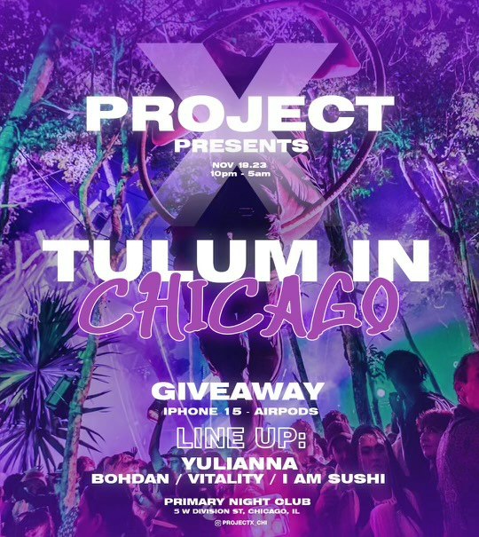 Embark on a journey to Tulum without leaving Chicago! Our nightclub will be transformed into a tropical oasis, complete with lush greenery, beachy vibes, and sultry beats. At 1 a.m., the excitement peaks with our sensational giveaway. Prizes include the highly sought-after iPhone 15, sleek AirPods, and a deluxe bottle of champagne. This night promises a fusion of style, music, and incredible prizes for an unforgettable experience!