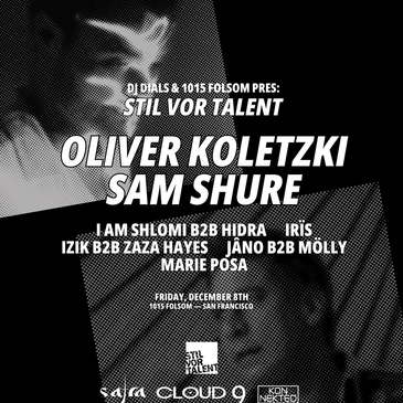 FRIDAY DECEMBER 8TH DJ Dials, Safra, Cloud9, Konnekted & 1015 Folsom Present: STIL VOR TALENT: Oliver Koletzki & Sam Shure + I AM SHLOMI B2B HIDRA • IRÏS • IZIK B2B ZAZA HAYES • JÂNO B2B MÖLLY • MARIE POSA 10pm • 21+ Only