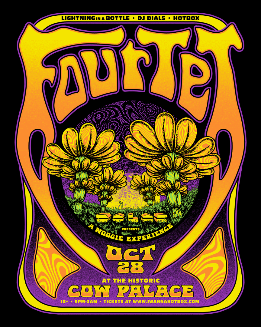 Four Tet collaborates with The Do LaB (creators of Lightning In A Bottle Festival and The Do LaB stage at Coachella) to debut a new, immersive experience inspired by the Woogie, inside the Cow Palace Arena on Halloween Weekend with a 5-HOUR open to close set from the prolific DJ / producer.