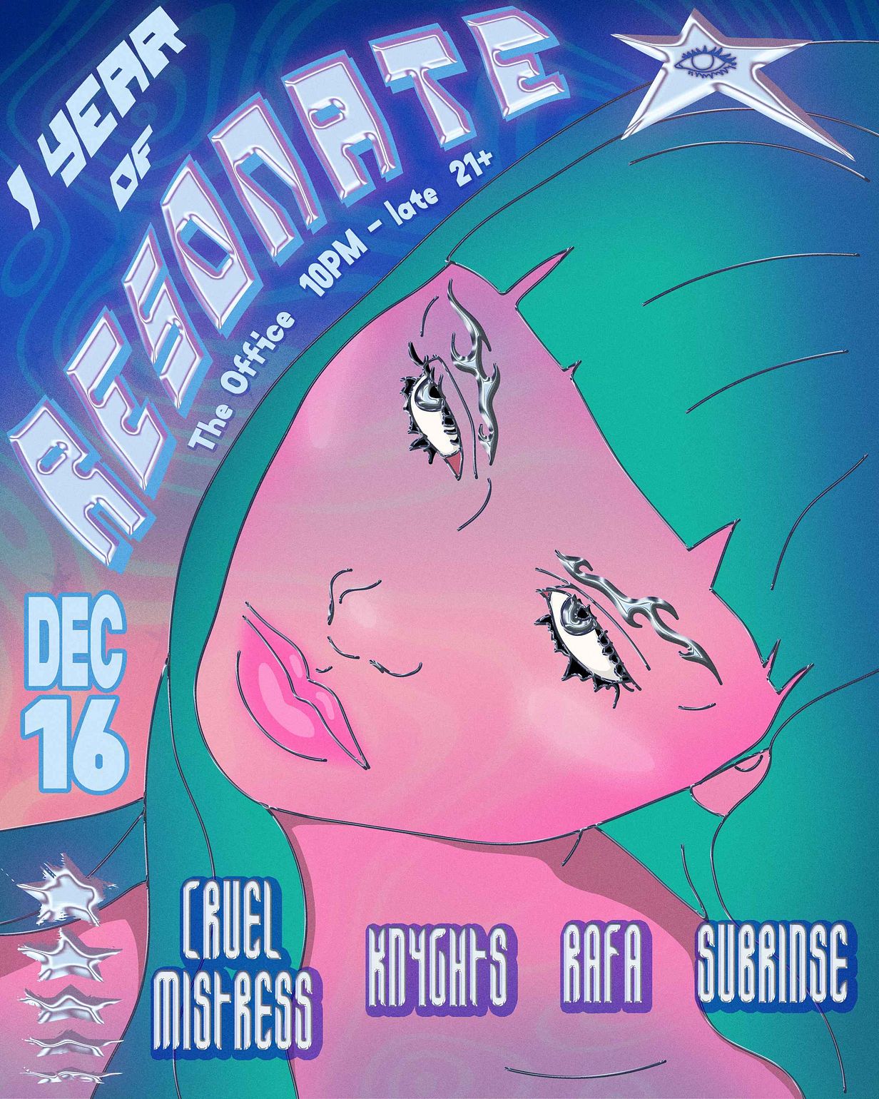Resonate featuring Cruel Mistress, Knyghts, Rafa, & Subrinse The Office 18+ | Doors at 10pm * Patrons under 21 will owe $5 charge paid at door *