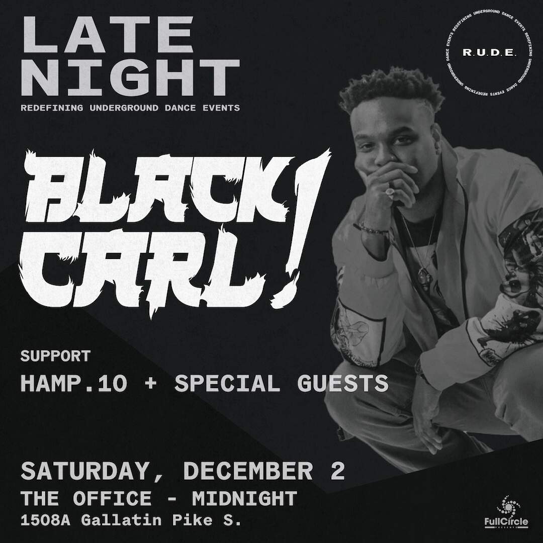 R.U.D.E. Late Night ft. Black Carl! with support from Hamp.10 + Special Guests Dec 2 Doors 12am | 18+ * Patrons under 21 will owe $5 charge paid at door *