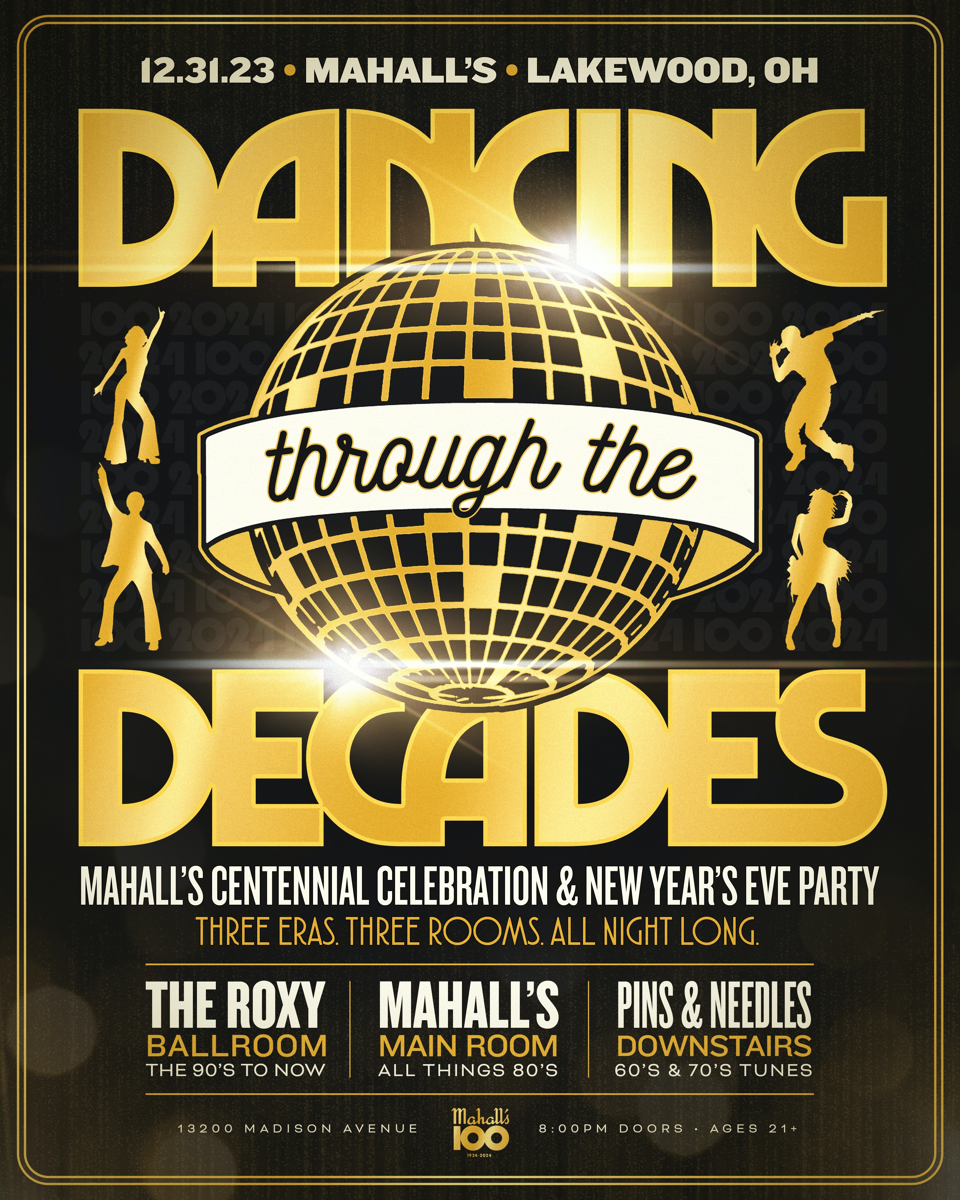 Ring in the new year and Mahall’s 100th year with a blowout party of Dancing Through The Decades! This centennial celebration will be one to remember with music from three eras in three rooms - all night long. Dress up as your favorite decade or era and get ready join us for our biggest party ever!