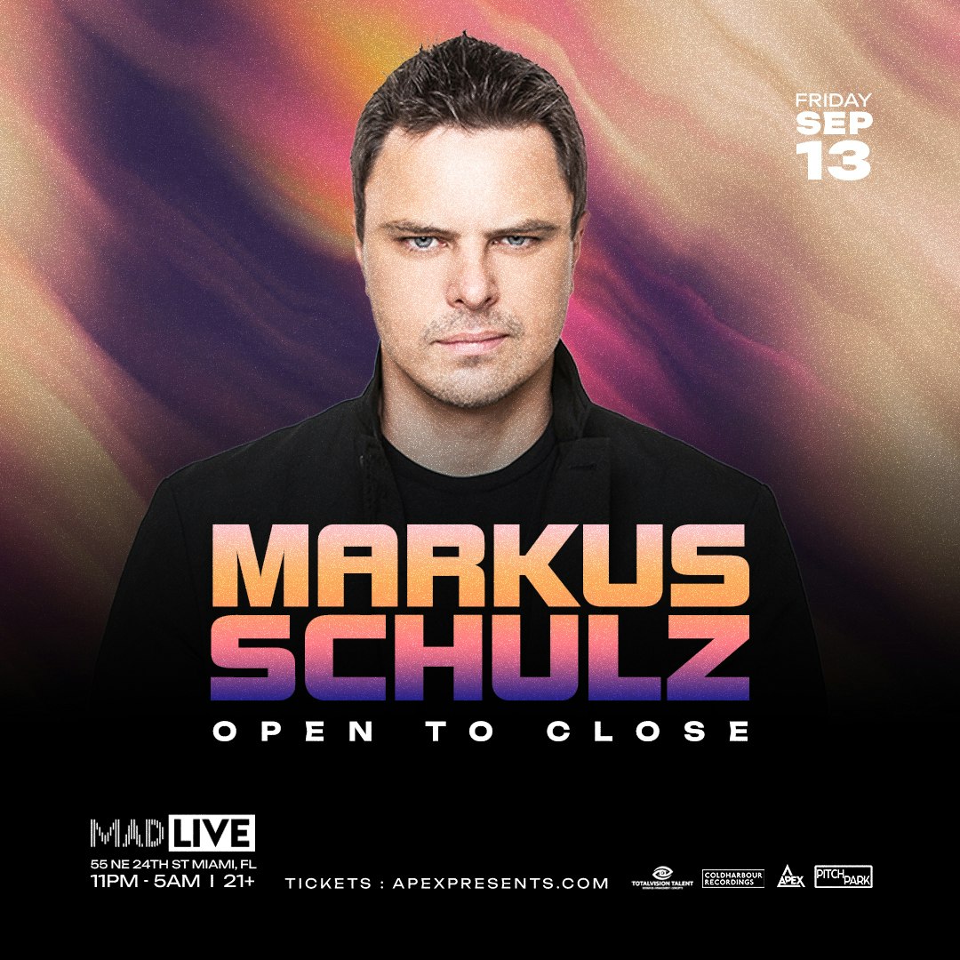 MAD LIVE at MAD Club Wynwood 55 Northeast 24th Street Miami, FL 33137 MARKUS SCHULZ Open To Close @ MAD LIVE Markus Schulz - Open To Close 11pm - 5am Come & join us for a Musical Journey with Markus Schulz Limited tickets Available for this event