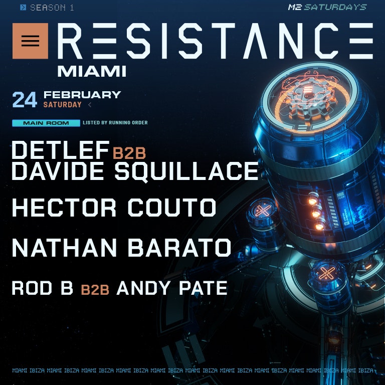 Join us on February 24 as Detlef B2B Davide Squillace, Hector Couto, and Nathan Barato take over M2 Miami for the RESISTANCE Club Residency! Presented by RESISTANCE Miami. This is a 21+ event