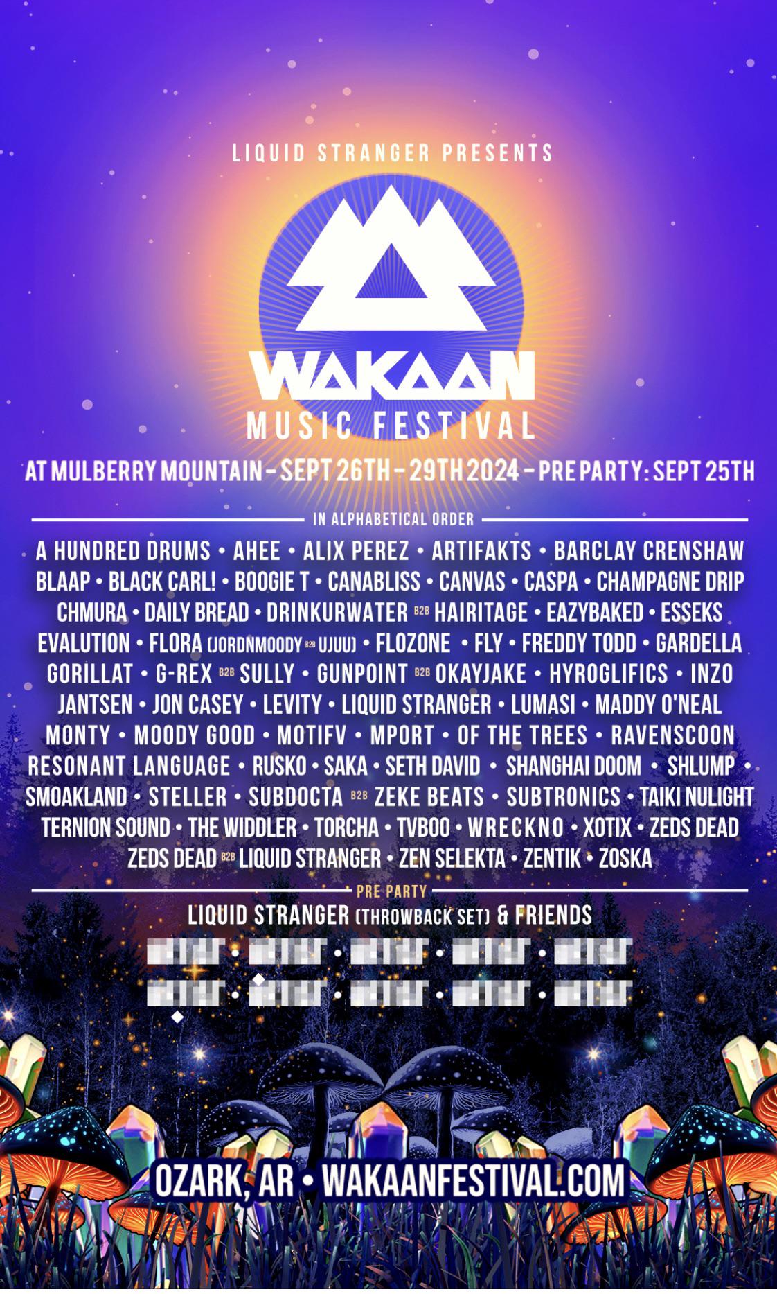 WAKAAN Music Festival, the brain-child of experimental free-form bass music producer Liquid Stranger launched in 2019 at Mulberry Mountain in Ozark, AR. The festival elevates artists signed to the label WAKAAN and it's affiliate label SSKWAN, along with many other like-minded acts. The festival caters to left of center electronic acts and in its inaugural year, Sold Out in advance. WMF hosts a myriad of electronic artists ranging in genre from free-form bass, dubstep, drum and bass, experimental, downtempo, glitch, future, chill-out and funk. The festival mirrors the ethos of the labels, that every person matters and is apart of the greater collective.