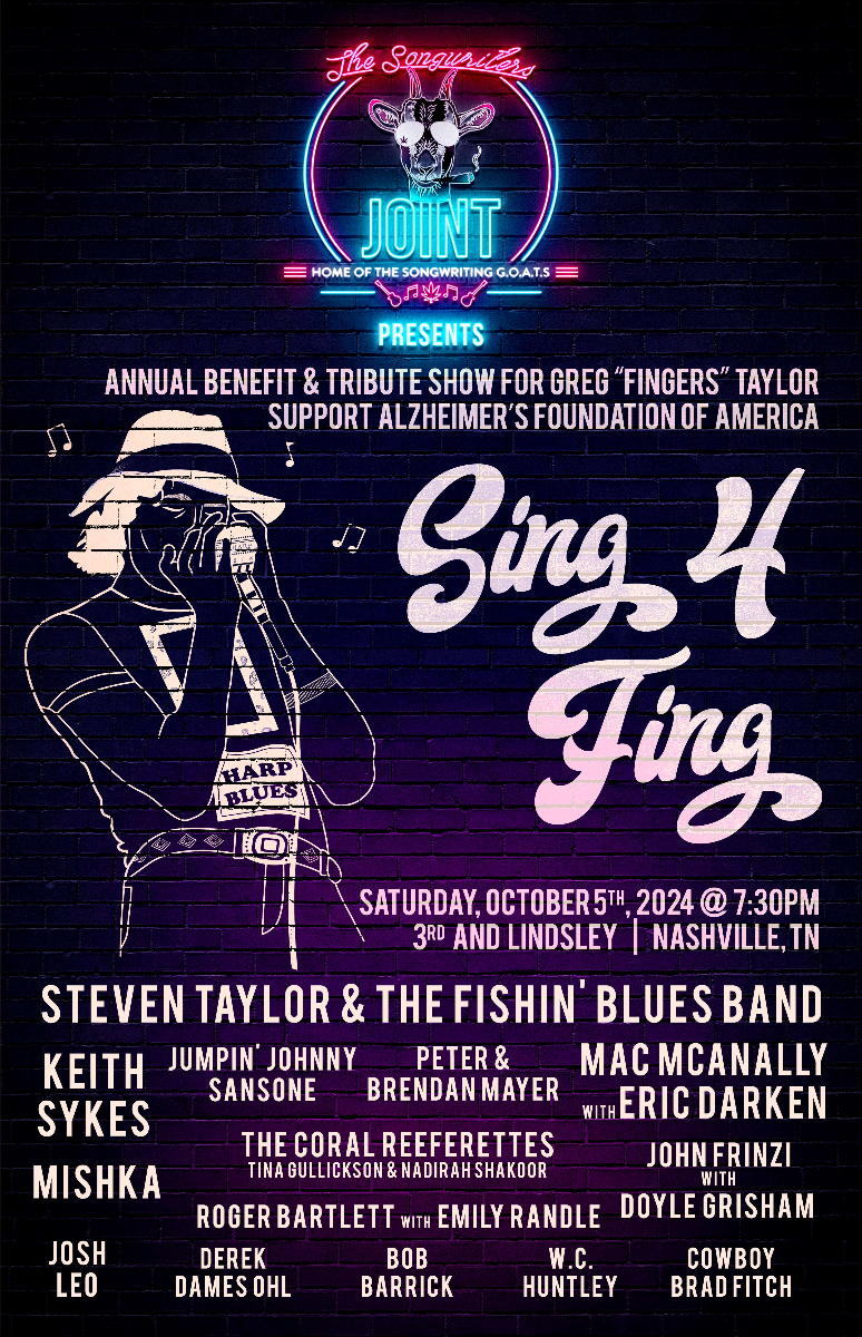 Sing 4 Fing - Annual Benefit & Tribute Show for Greg "Fingers" Taylor Supporting Alzheimer's Foundation of America feat. Bob Barrick , Cowboy Brad Fitch , Derek Dames OHL , Doyle Grisham , Emily Randle , Eric Darken , Lloyd "Hurricane" Munn , John