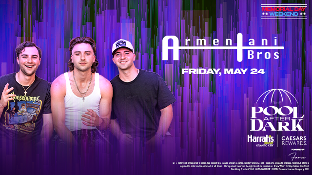 Experience an electrifying Friday night at The Pool After Dark, Harrah's Resort, Atlantic City, featuring the sensational Armentani Brothers. Dive into the heart of Atlantic City's nightlife with an unforgettable DJ set by this dynamic trio of brothers - George, Jimmie, and John Armentani. Hailing from Philadelphia, these brothers have captivated audiences worldwide with their energetic performances and unique sound, earning acclaim from industry giants like Steve Aoki and Kaskade.