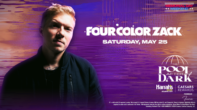 Join us at Harrah's Resort for an electrifying Memorial Day Weekend Saturday night at The Pool After Dark, where the vibrant Atlantic City nightlife comes to life. Step into a world of rhythmic bliss with Four Color Zack, the Red Bull Thre3style World Champion and a master of the turntables. As a "DJ's DJ" and a top party rocker, Four Color Zack is renowned for his technically dazzling sets that seamlessly blend genres, captivating audiences from Vegas megaclubs to underground parties.