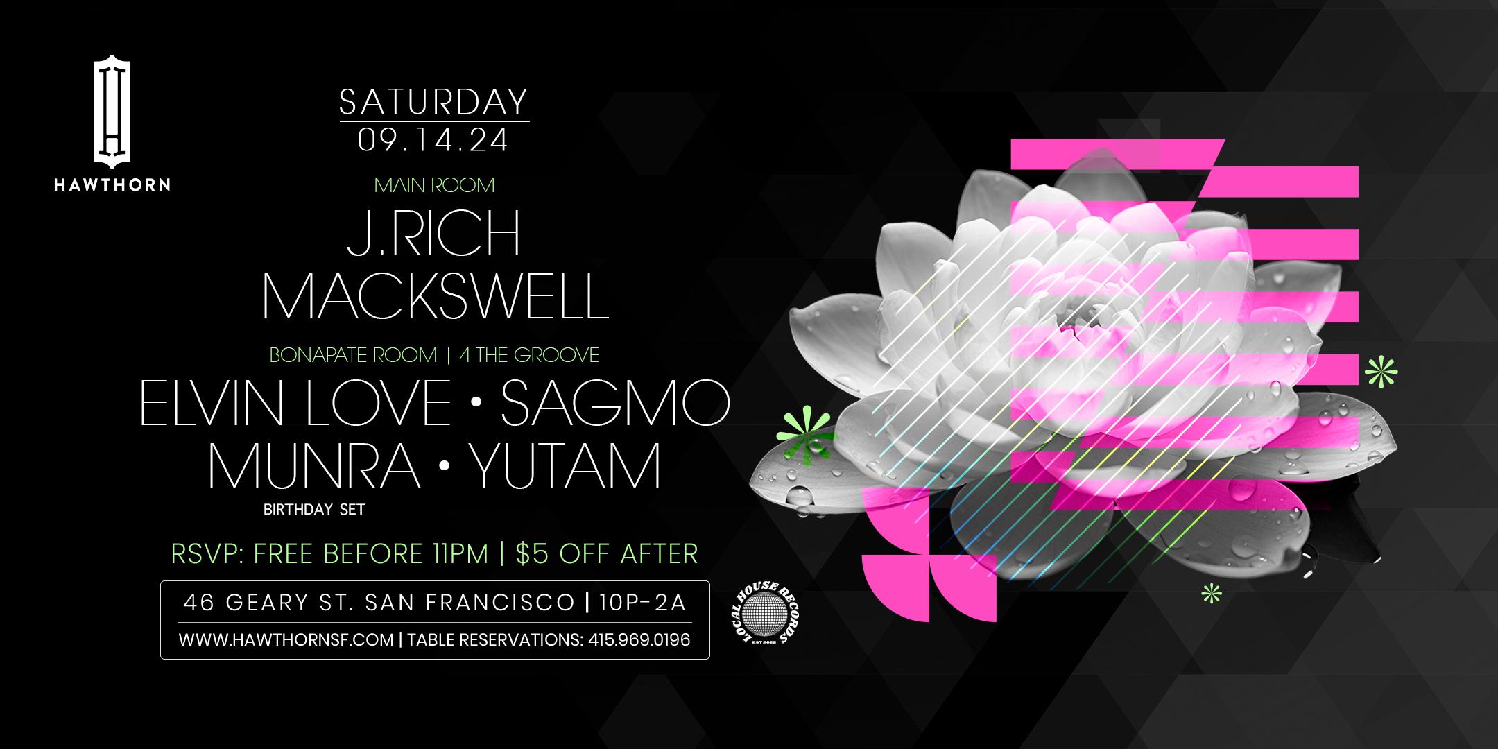 Main Room (Open Format | Hip Hop | Top 40): J.Rich - Las Vegas, Mackswell Bonaparte Room (House Music | EDM): Elvin Love, Sagmo, Munra, Yutam RSVP: Free before 11pm; $5 OFF After