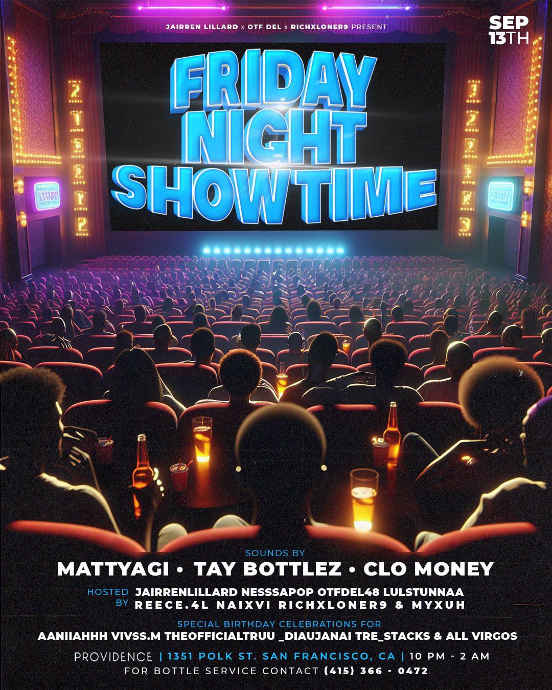 FRIDAY NIGHT SHOWTIME Turn up the Heat & Elevate your night with Non-Stop Hip-Hop Vibes! FRIDAY NIGHT SHOWTIME! Turn up the Heat & Elevate your night with Non-Stop Hip-Hop Vibes! ๐Music By: @mattyagi - @djclomoney - @djtaybottlez1515 ๐ Presented by: @jairrenlillard ๐ Profile link - Free RSVP Guest List before 11pm โโ #hiphop #openformat #SanFrancisco #SF #thecity #sfgate #Bayareabuzz #sfparty #sfevents #sfweekly #partysf #weeklysf #sanfranciscoparty #bayarea #sfclubs #sfclubbing #dothebay #rap #music #rapper #trap #beats #hiphopmusic #providenceSF