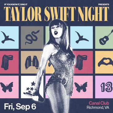 Taylor Swift Night at Canal Club Presented by If You Know It Sing It SEP 6, 2024 Canal Club - Upstairs - Richmond 8:00 DOORS 9:00 SHOW $18 ADV $20 DOS Ages 18+