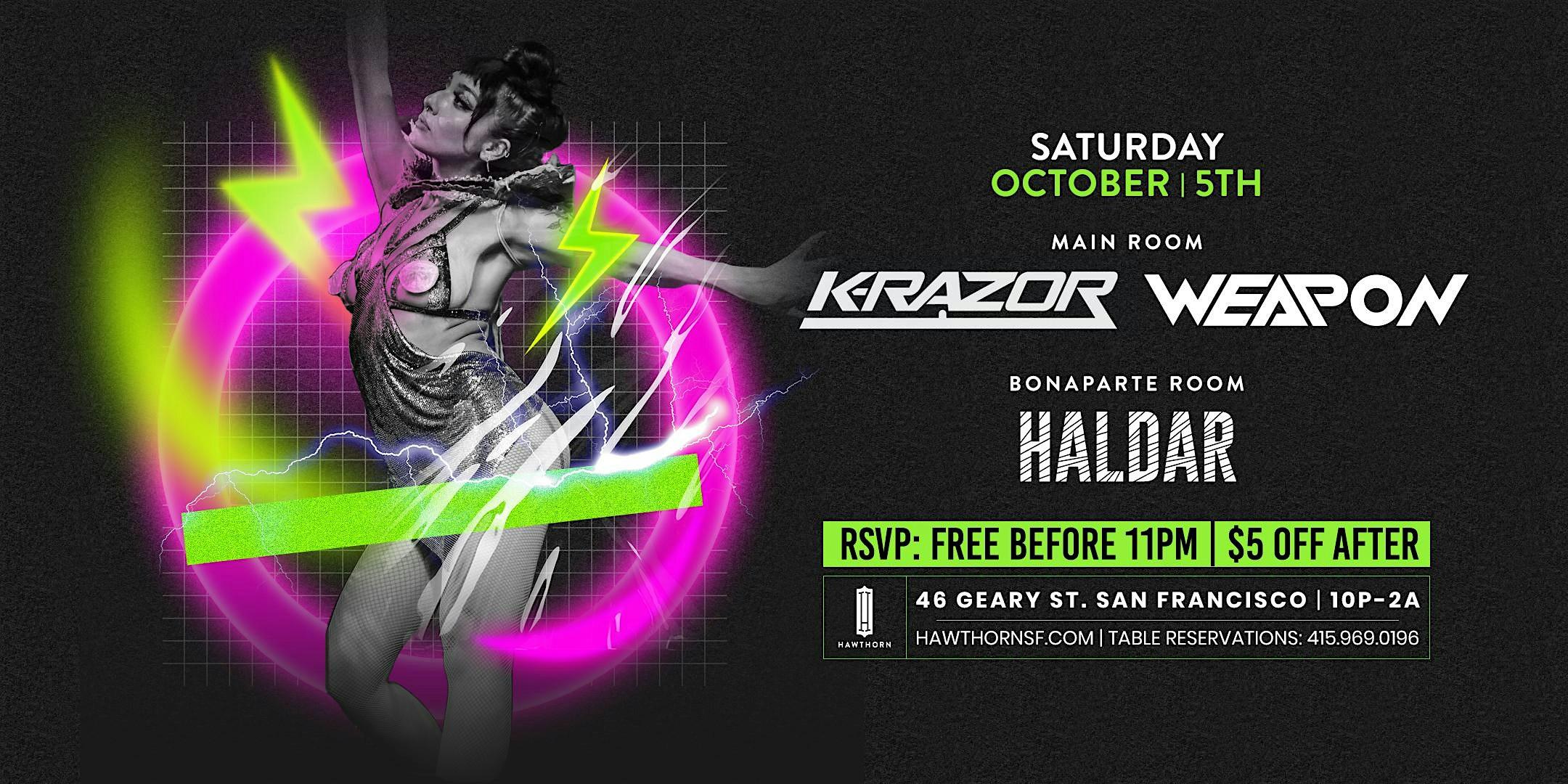 Main Room (Open Format | Hip Hop | Top 40): Weapon + K-Razor Bonaparte Room (House Music | EDM): Haldar RSVP: Free before 11pm; $5 OFF After
