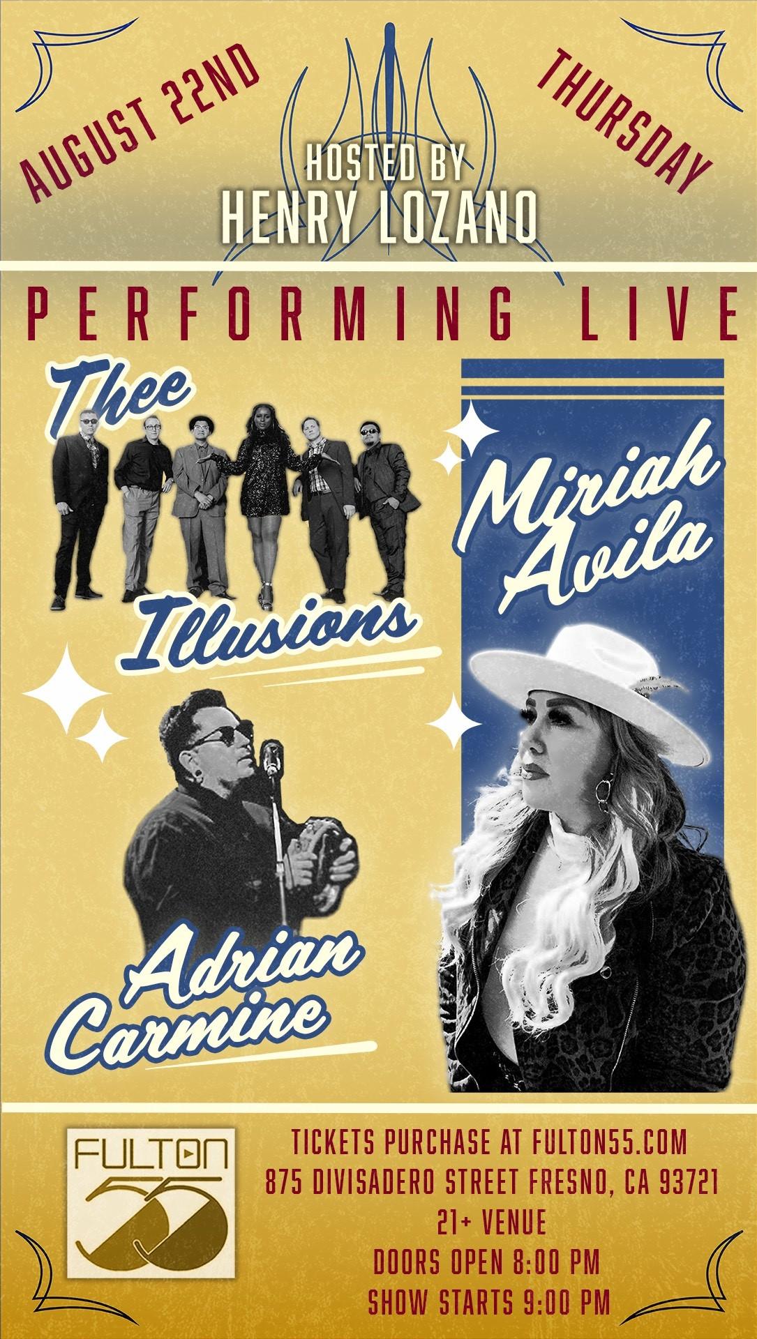 Thursday, Aug. 22 Fulton 55 presents: The mind blowing sounds of Thee Illusions, soulful tunes by Miriah Avila, and electrifying performance by Adrian Carmine! Hosted by Henry Lozano.