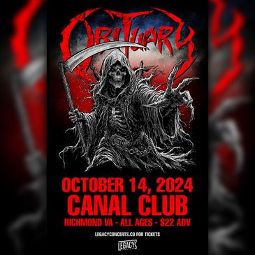 Legacy Concerts Presents Obituary at Canal Club Richmond, VA 6:30 PM Doors Open 7:30 PM Show Starts $22 Advance $25 Day-of-Show All Ages More Great Events: http://legacyconcerts.co @legacyconcerts.co
