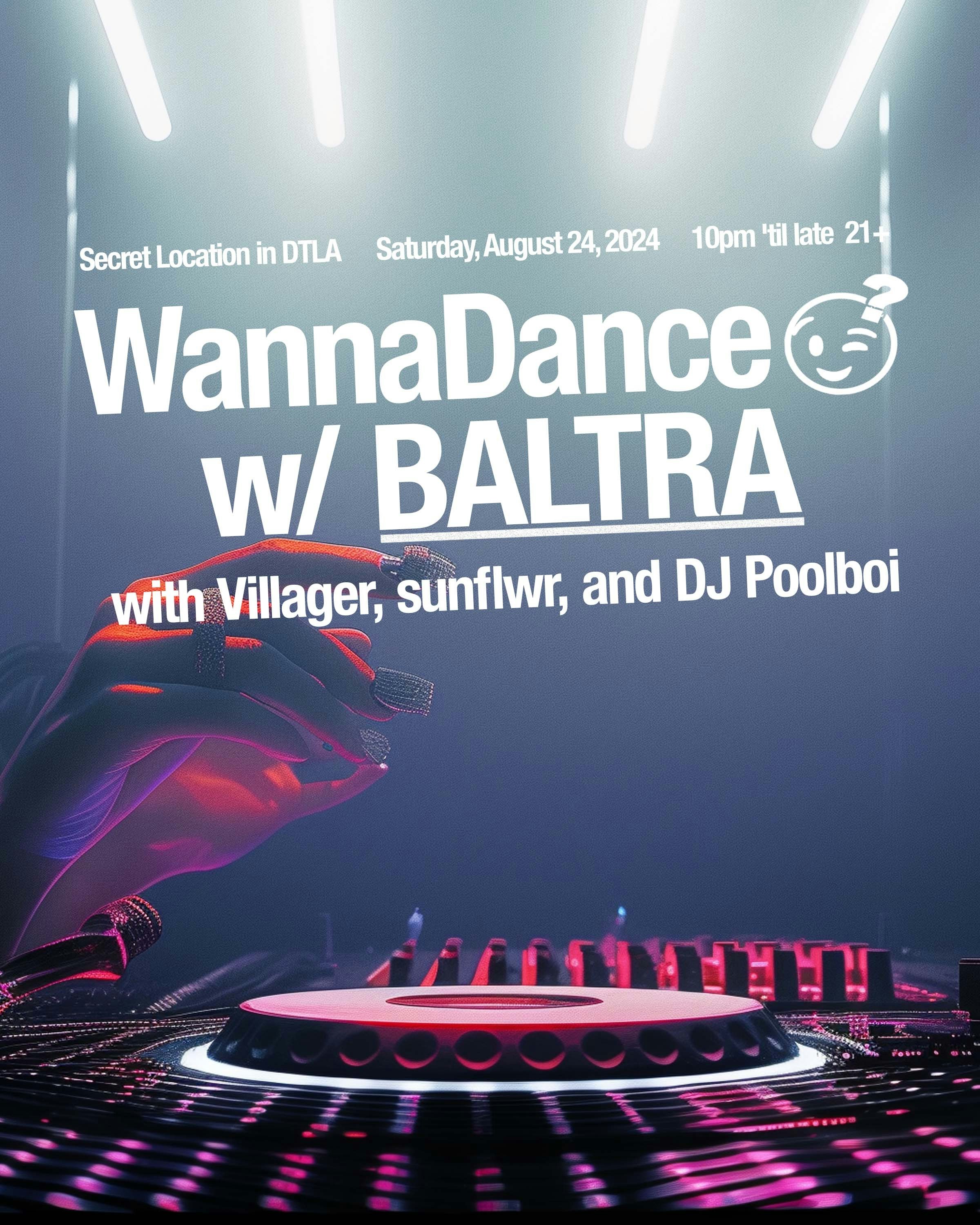 Wanna Dance? w/ Baltra, Villager, sunflwr and DJ Poolboi Saturday, August 24, 2024 Secret Location in DTLA 10pm 'til late 21+ \*\*\*Location will be sent to all ticket holders on day of show\*\*\* Presented by Minty Boi. This is an 18+ event