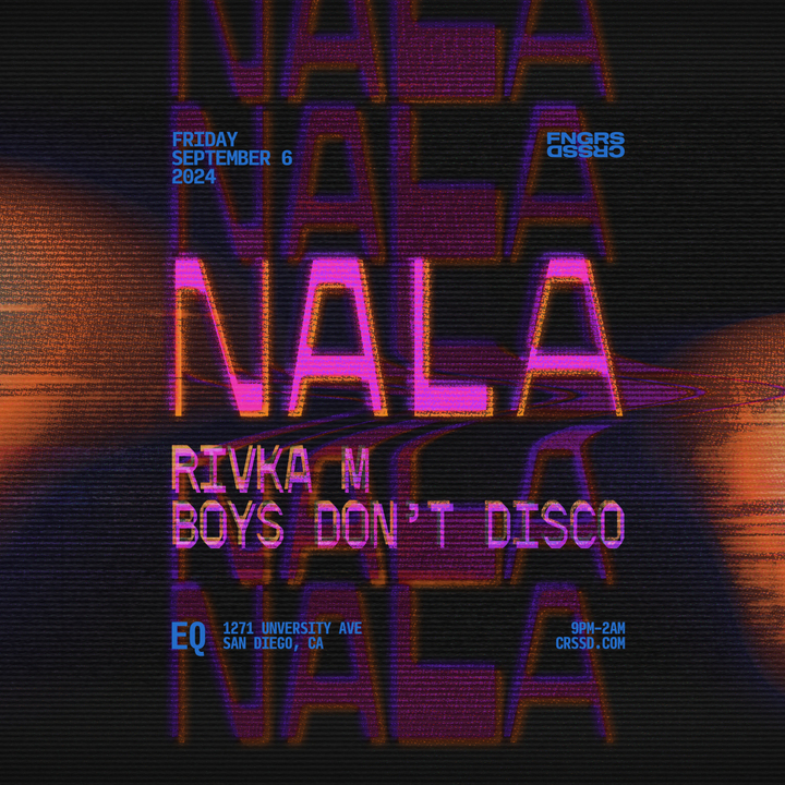 FNGRS CRSSD presents NALA at EQ September 6, 2024 NALA RIVKA M BOYS DON'T DISCO DOORS 9:00 PM 21+ - - - - - - - - - - - - - - - - - - - - - - - - - - - - - - - - - - - - - - - - - - - NALA Website: https://www.thisisnala.com Instagram: https://www.instagram.com/thisisnala/?hl=en Spotify: https://open.spotify.com/artist/2rTvgpXa8PA62yBCfwdQxf?si=J1MuiCatTA-YL2a7O2xyNw FNGRS CRSSD Facebook: www.facebook.com/FNGRSCRSSD Instagram: www.instagram.com/fngrscrssd Twitter: www.twitter.com/FNGRSXCRSSD Website: www.CRSSD.com