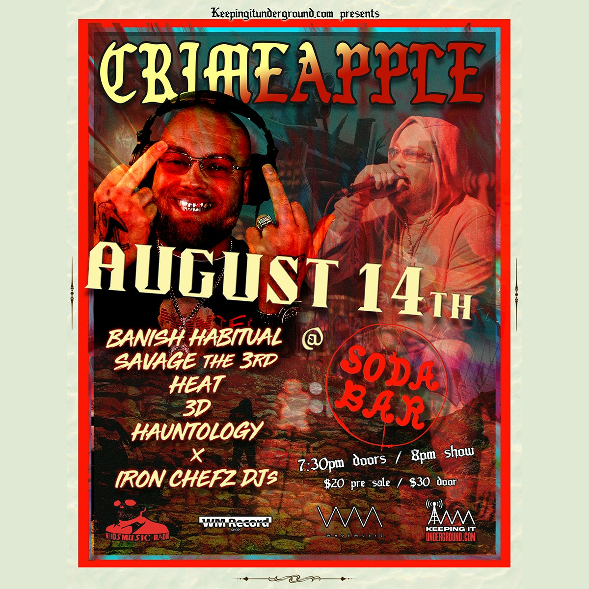 KeepingItUnderground.com Presents: Crimeapple, Banish Habitual, Savage The 3rd, Heat, 3D, Hauntology and Iron Chefz DJ's live at the Soda Bar San Diego, CA. This will be an allstar underground hip hop night that you don't want to miss. The Iron Chefz DJ's will be supplying turntablism and music throughout the night, in between the artists performances. Make sure to purchase the pre-sale tickets and see you at the event!