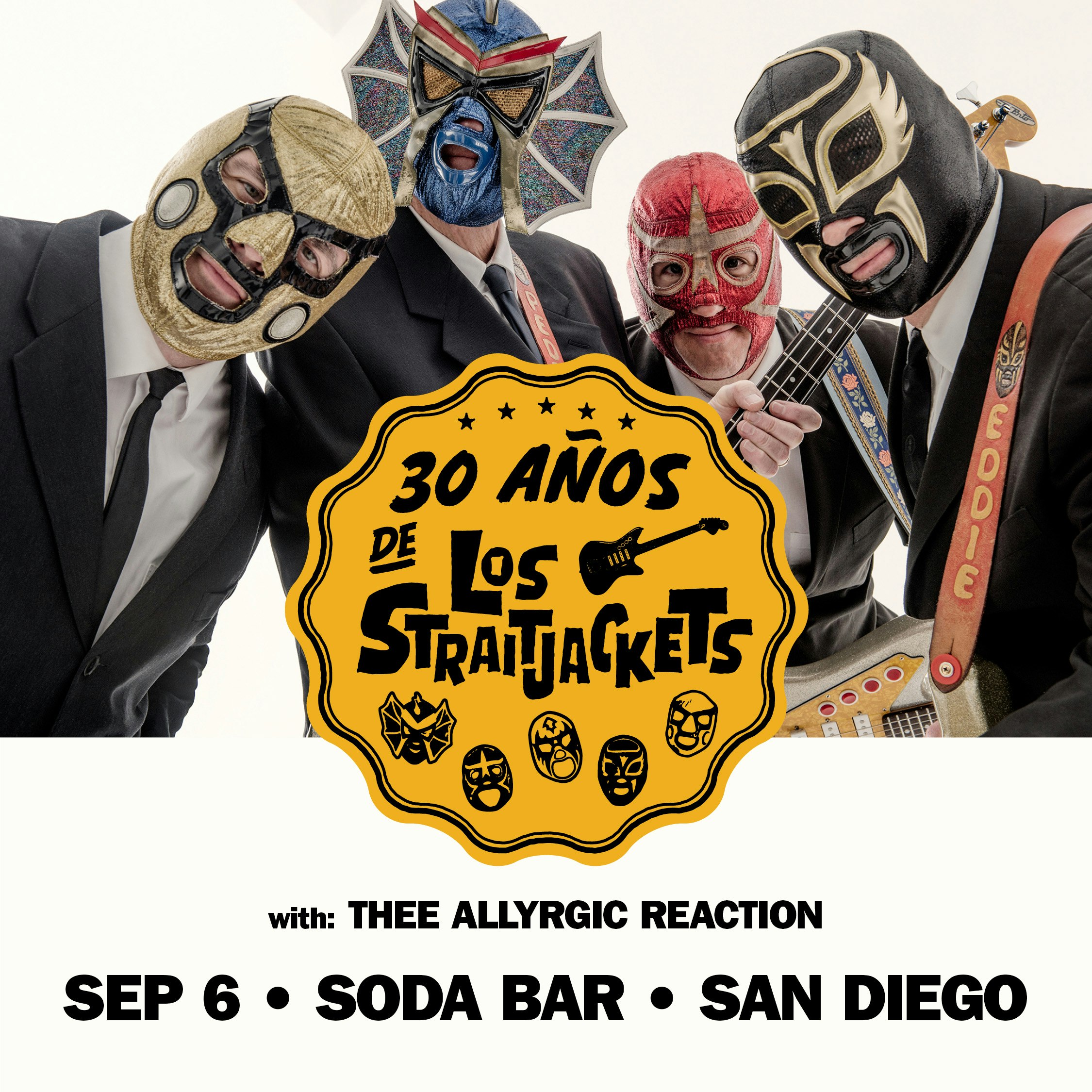 Los Straitjackets are the leading practitioners of the lost art of the guitar instrumental. Using the music of the Ventures, The Shadows, and with Link Wray and Dick Dale as a jumping off point, the band has taken their unique, high energy brand of original rock & roll around the world. Clad in their trademark Lucha Libre Mexican wrestling masks, the ‘Jackets’ have delivered their trademark guitar licks across 30 years, 16 albums, thousands of concerts and dozens of films and TV shows. Viva Los Stratjackets!