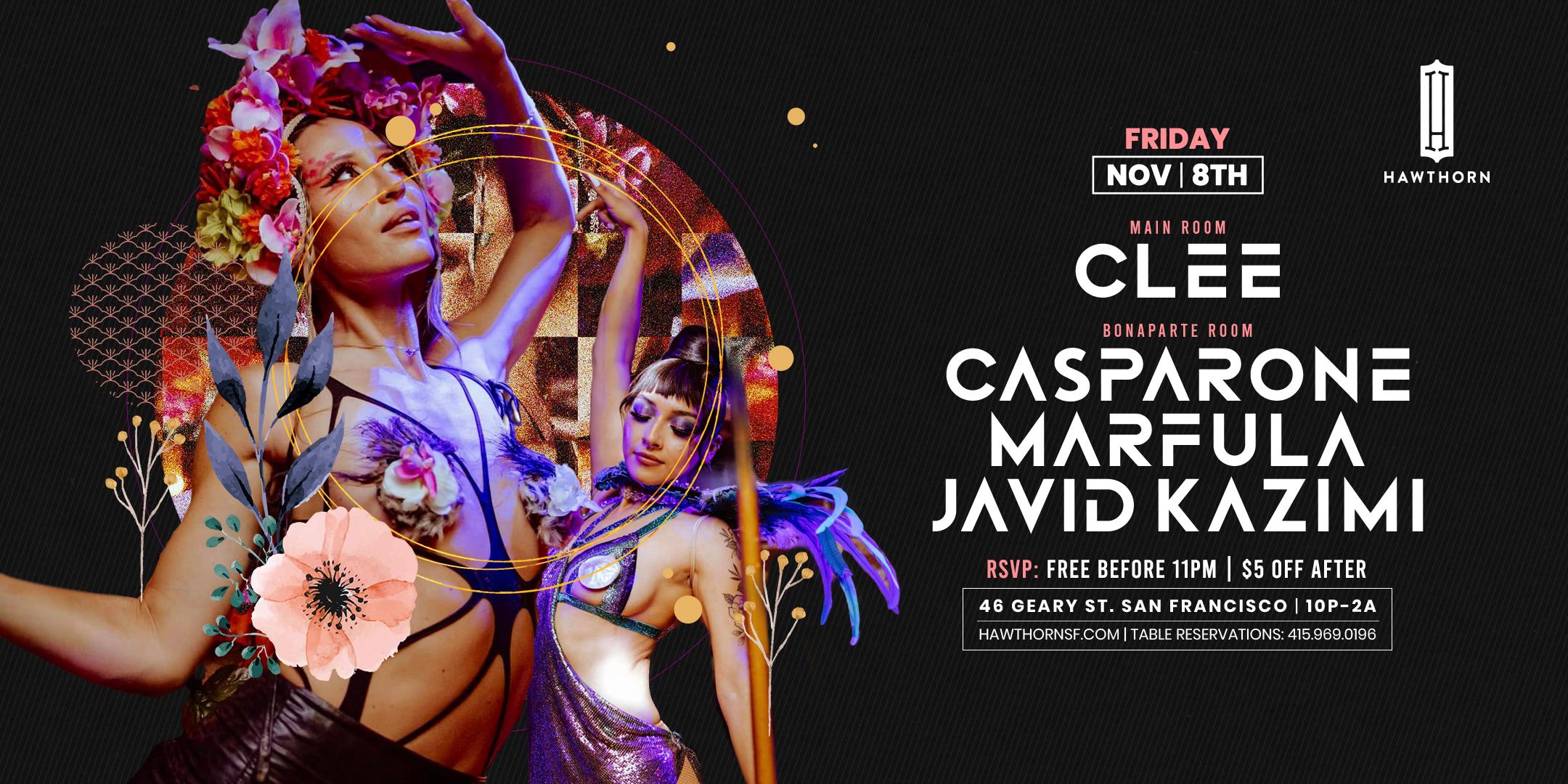 Main Room (Open Format | Hip Hop | Top 40): Clee Bonaparte Room (House | EDM): CasparOne, Marfula, Javid Kazimi RSVP: Free before 11pm; $5 OFF After